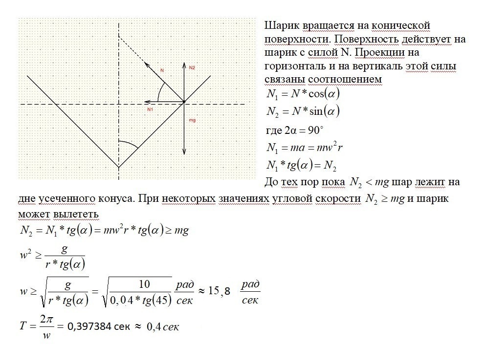 Сосуд,имеющий форму конуса с радиусом основания 4 см и углом при вершине 90 градусов, вращается вокруг вертикальной оси, совпадающей с высотой конуса. При какой угловой скорости вращения сосуда шарик, лежащий на его дне, будет выброшен наружу? Трением пренебречь. Определите период обращения шарика в этом случае.