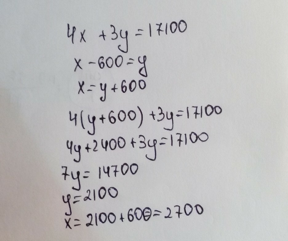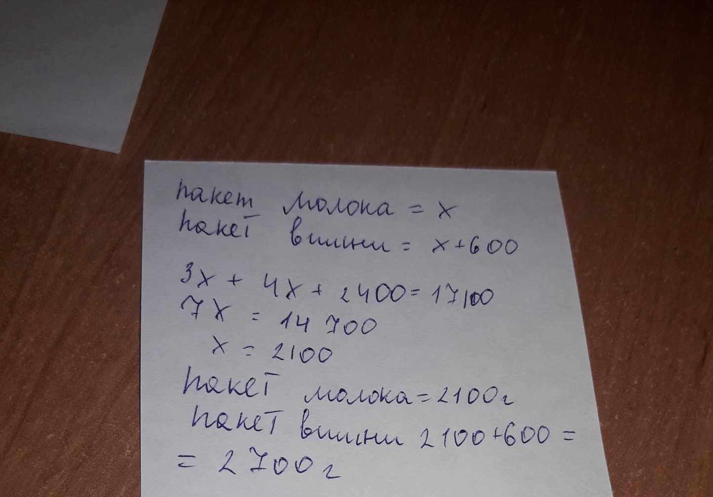 4 пакета вишни и 3 пакета молока весят 17100гр. один пакет вишни на 600 гр больше чем молоко. Сколько весит один пакет вишни и один пакет молока