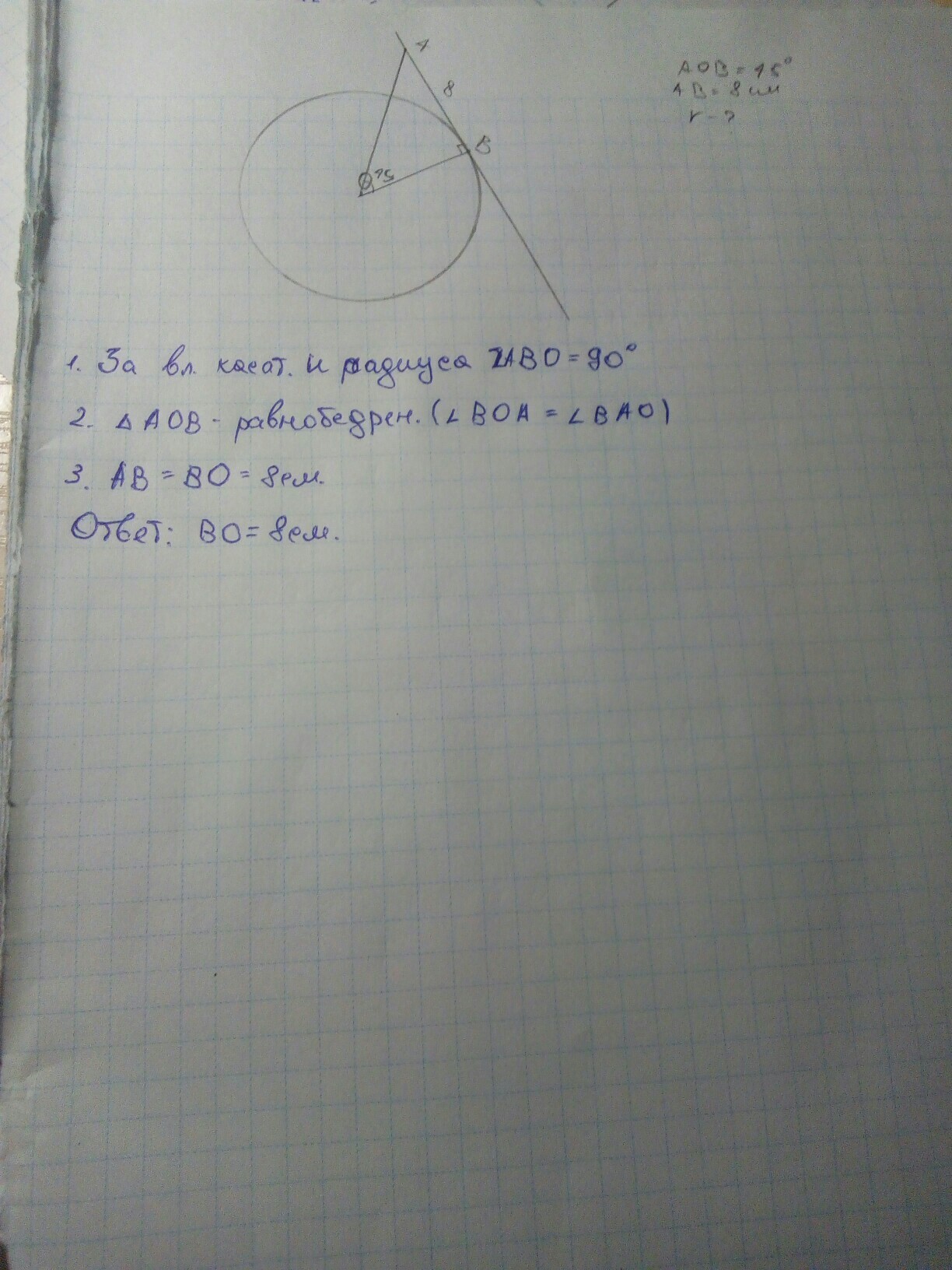 К окружности с центром О провели касательную АВ (В-точка касания).Найдите радиус окружности, если АВ=8см и угол АОВ=45 градусам.