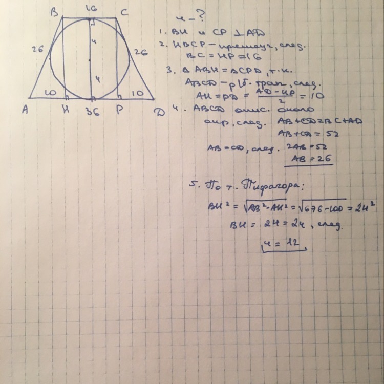 Равнобедренная трапеция описана около окружности. Основания трапеции равны 16 см и 36 см. Найдите радиус этой окружности.