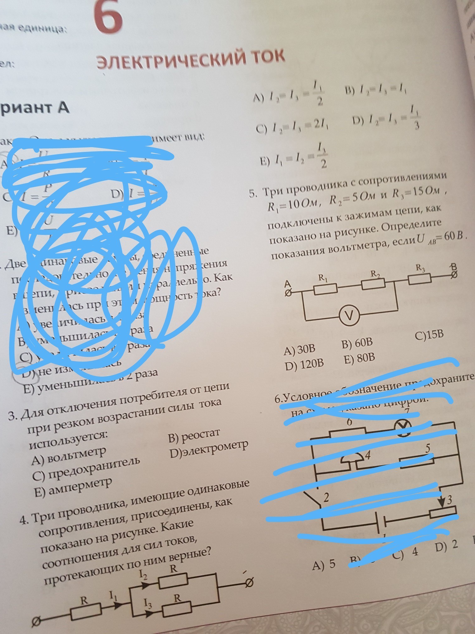 5. I=U/R=60/(10+5+15)=2 A; Uвольт.=I*(R1+R2)=2*(10+5)=30 B.