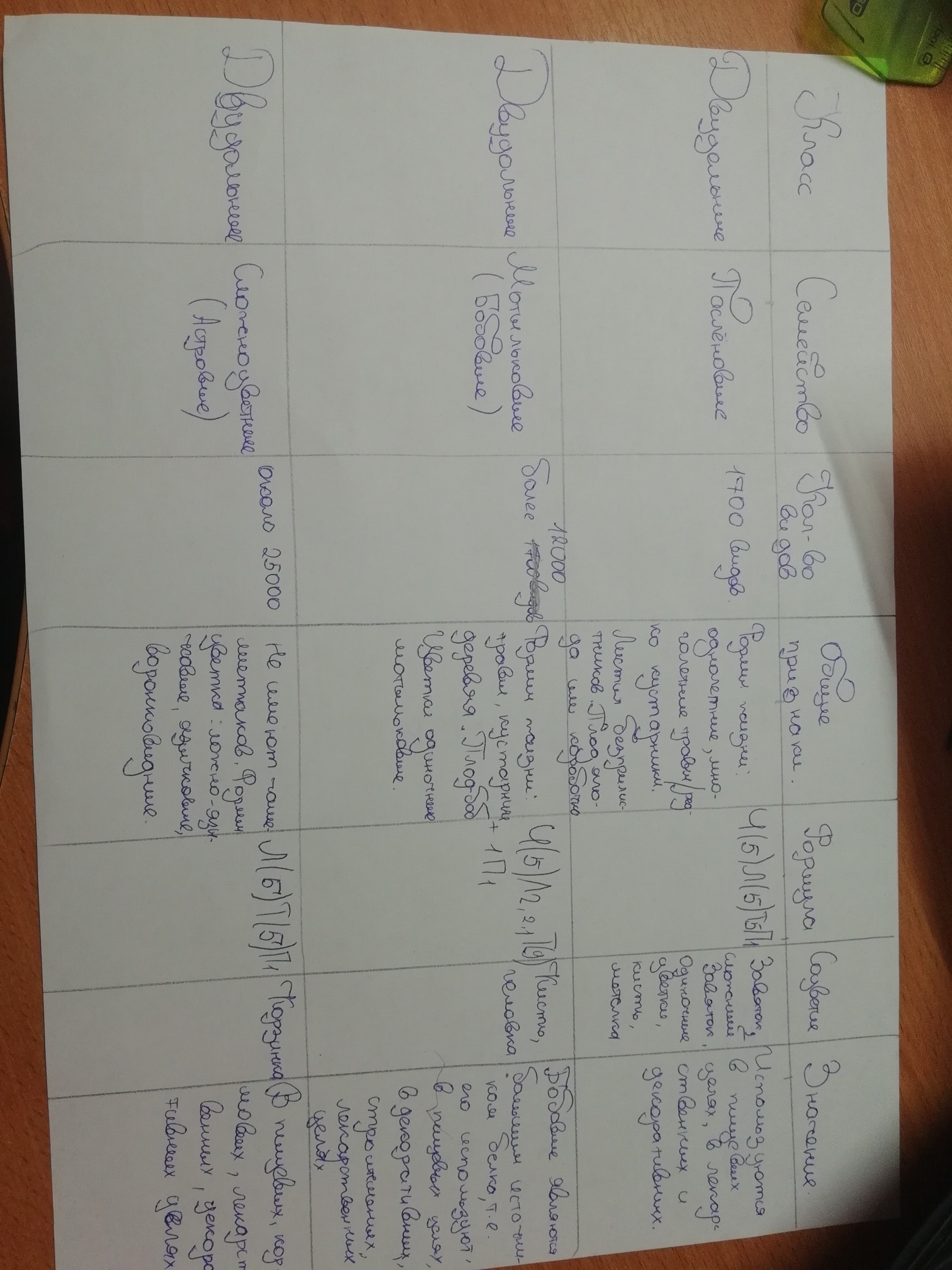 Класс, Семейства, Кол-во видов, общие признаки, формула, соцветие, значение.