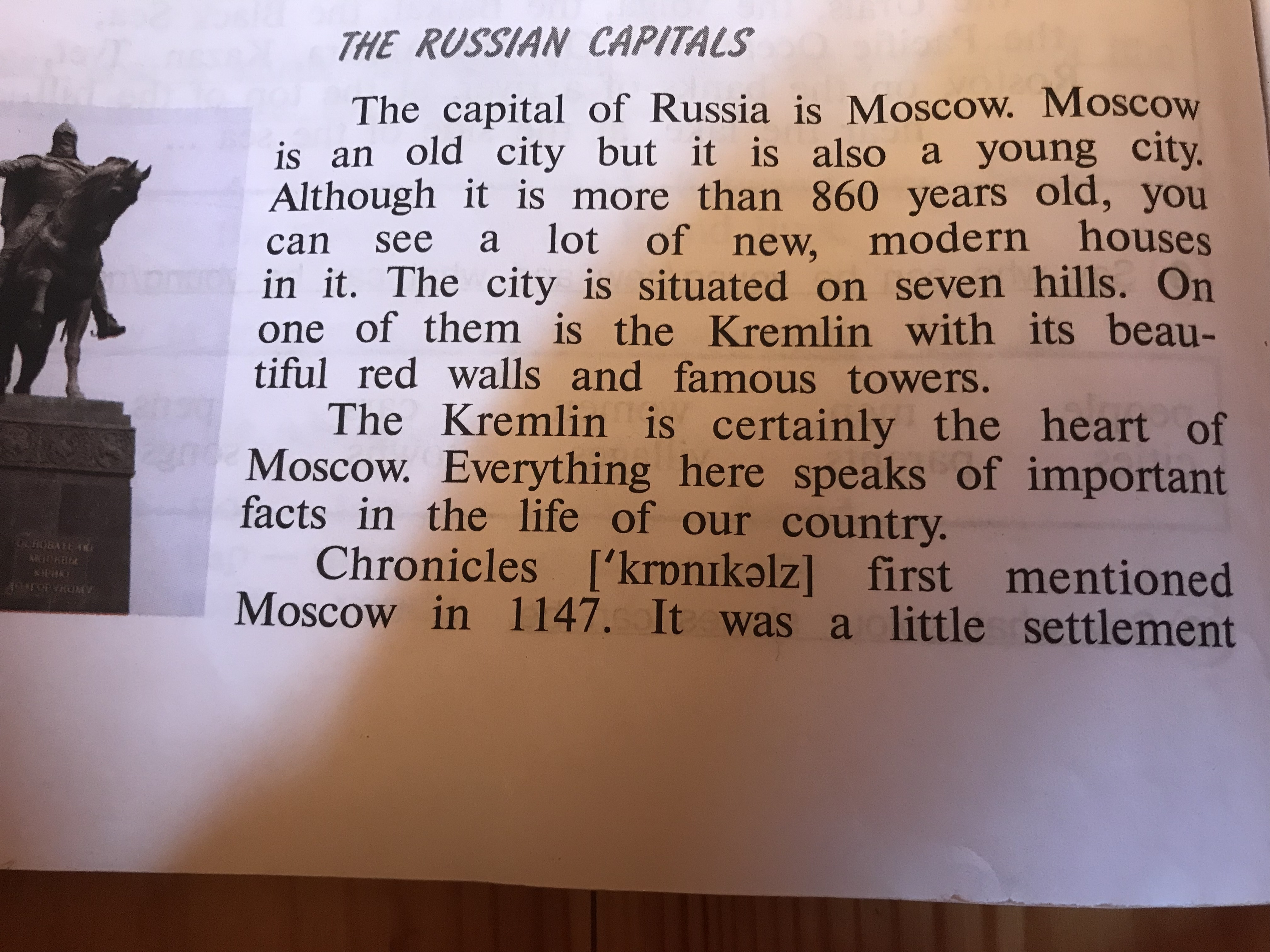1 It's more than 860 years old.2 It's situated on seven hills.3 It was founded by Prince Yuri Dolgoruky.4 It was in the 16th century5 Tsar Peter the Great did.6 St Petersburg became the capital instead of Moscow.