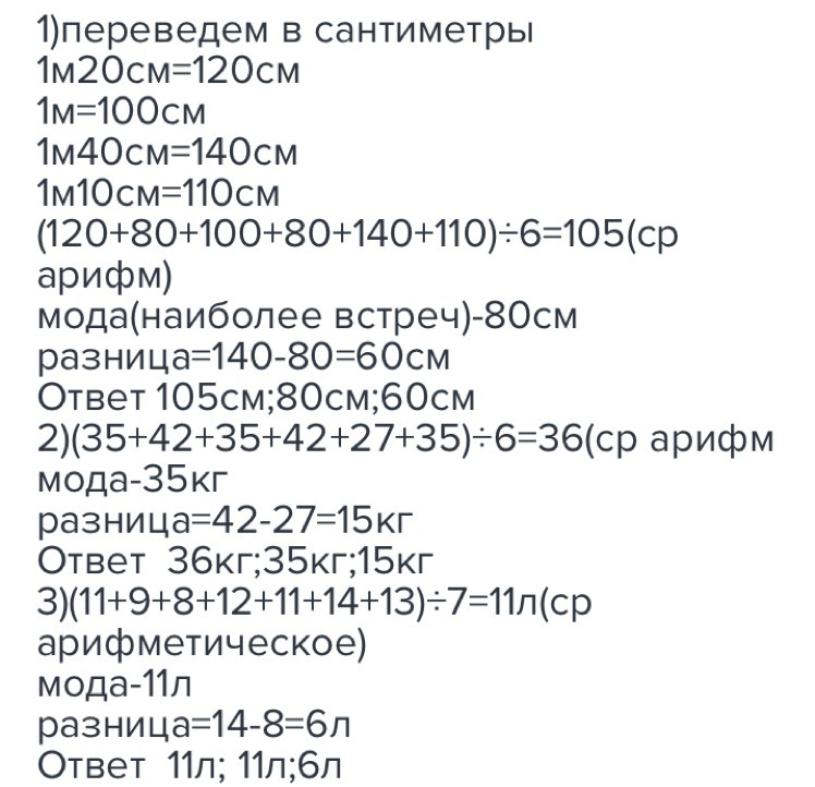 определи среднее арифметическое значение,наиболее часто встречаемое число и наиболщую разницу по кождой группе информаций