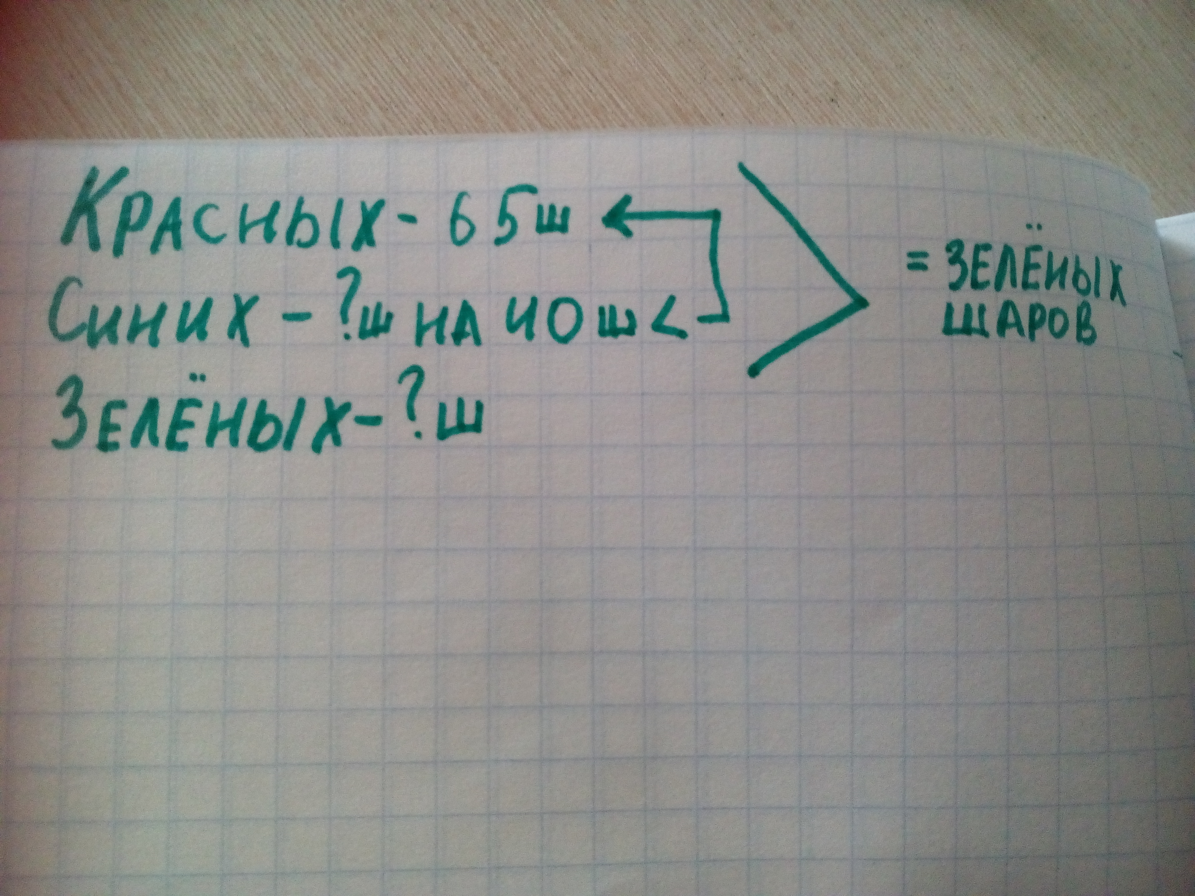 В корзине 65 красных шаров ,синих на 40 шаров меньше ,а зелёных столько ,сколько красных и синих вместе .сколько зелёных шаров в корзине ?краткая запись к задаче