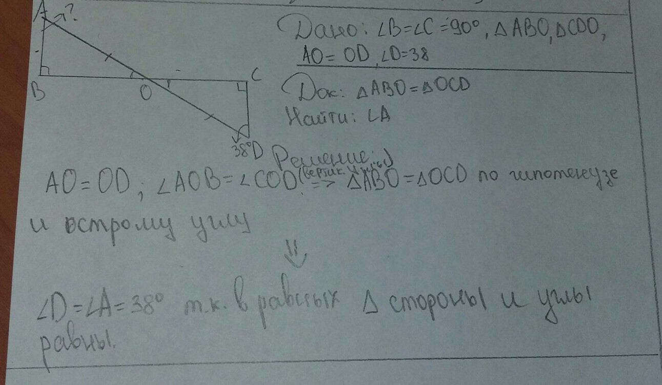 На рисунке угол B=углу С=90 градусов AO=OD.Докажите что треугольник ABO=треугольнику OCD,и найдите угол А,если угол D= 38 градусов