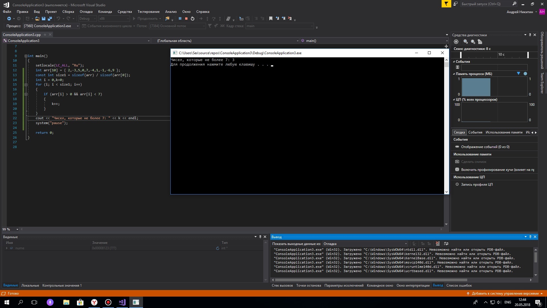 int main(){ setlocale(LC_ALL, "Ru"); int arr[10] = { 2,-3,5,0,7,-4,1,-1,-6,9 }; const int size1 = sizeof(arr) / sizeof(arr[0]); int i = 0,k=0; for (i; i < size1; i++) { if (arr[i] > 0 && arr[i] < 7) { k++; } } cout << "Чисел, которые не более 7: " << k << endl; system("pause");