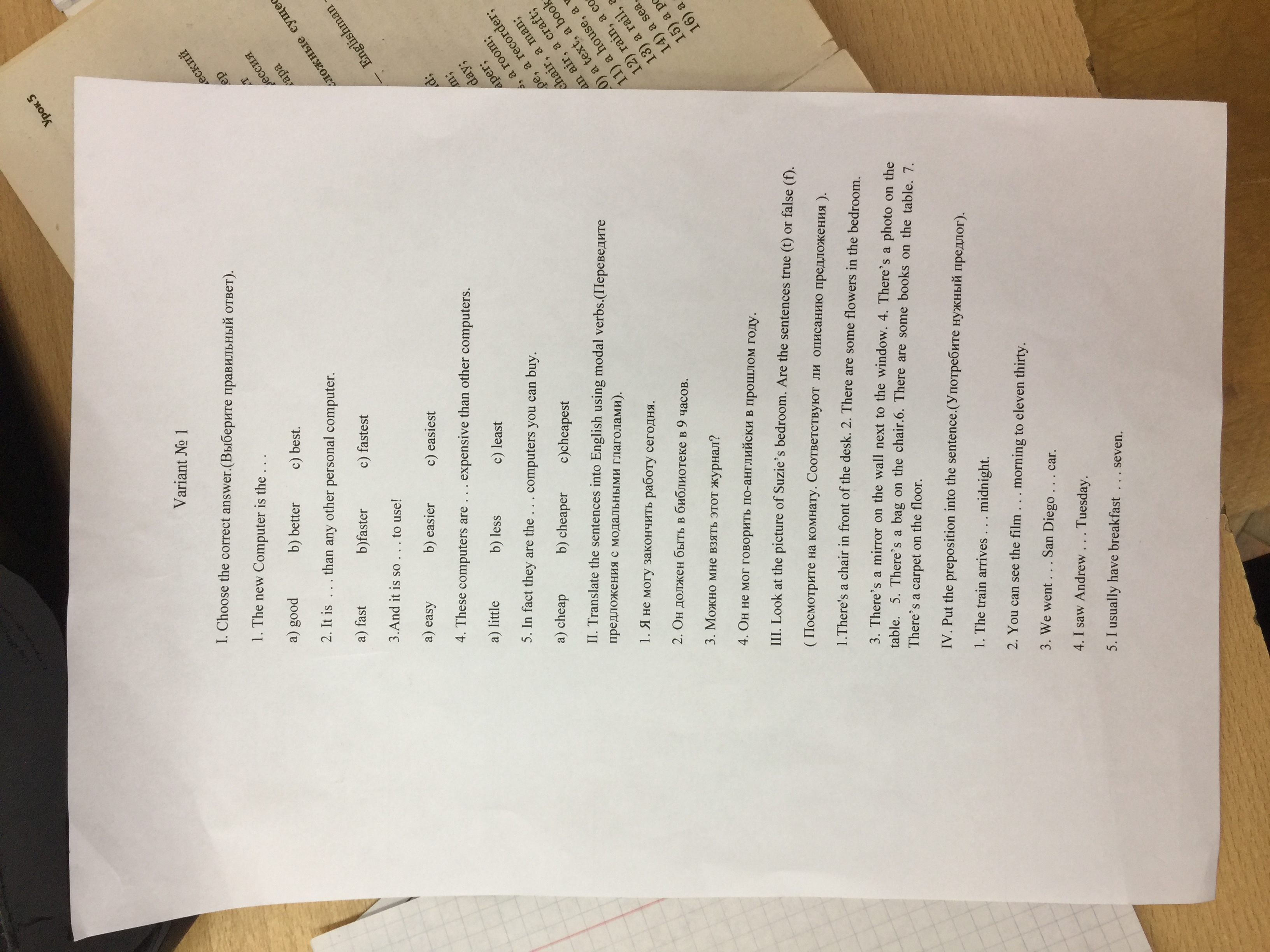 IV. Put the preposition into the sentence (употребите нужный предлог)