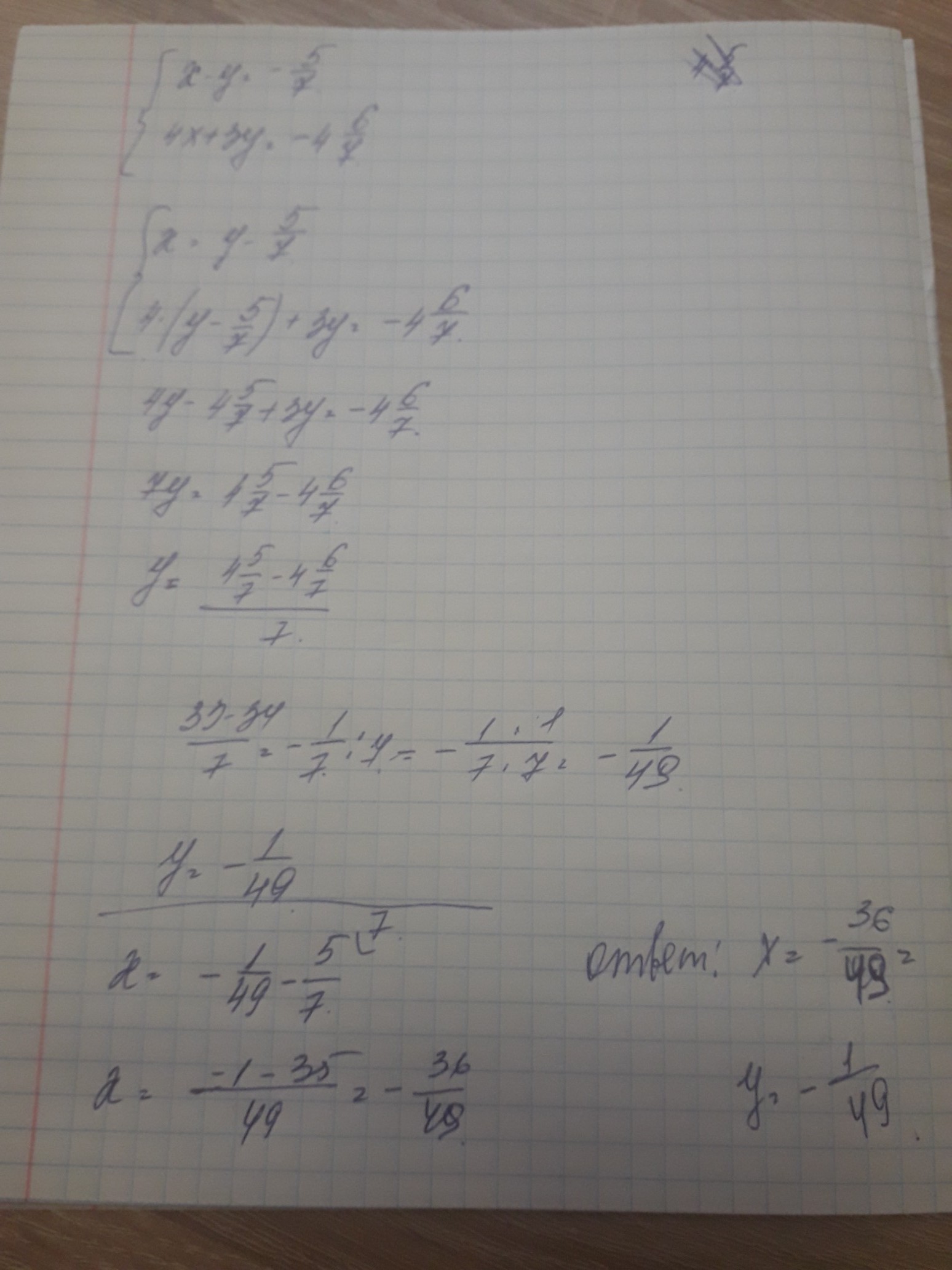 ответ : х= - 36/49, у= - 1/49