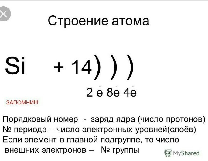 Атом кремния состоит из положительно заряженного ядра (+14), состоящего из 14 протонов и 14 нейтронов, вокруг которого по 3-м орбитам движутся 14 электронов.