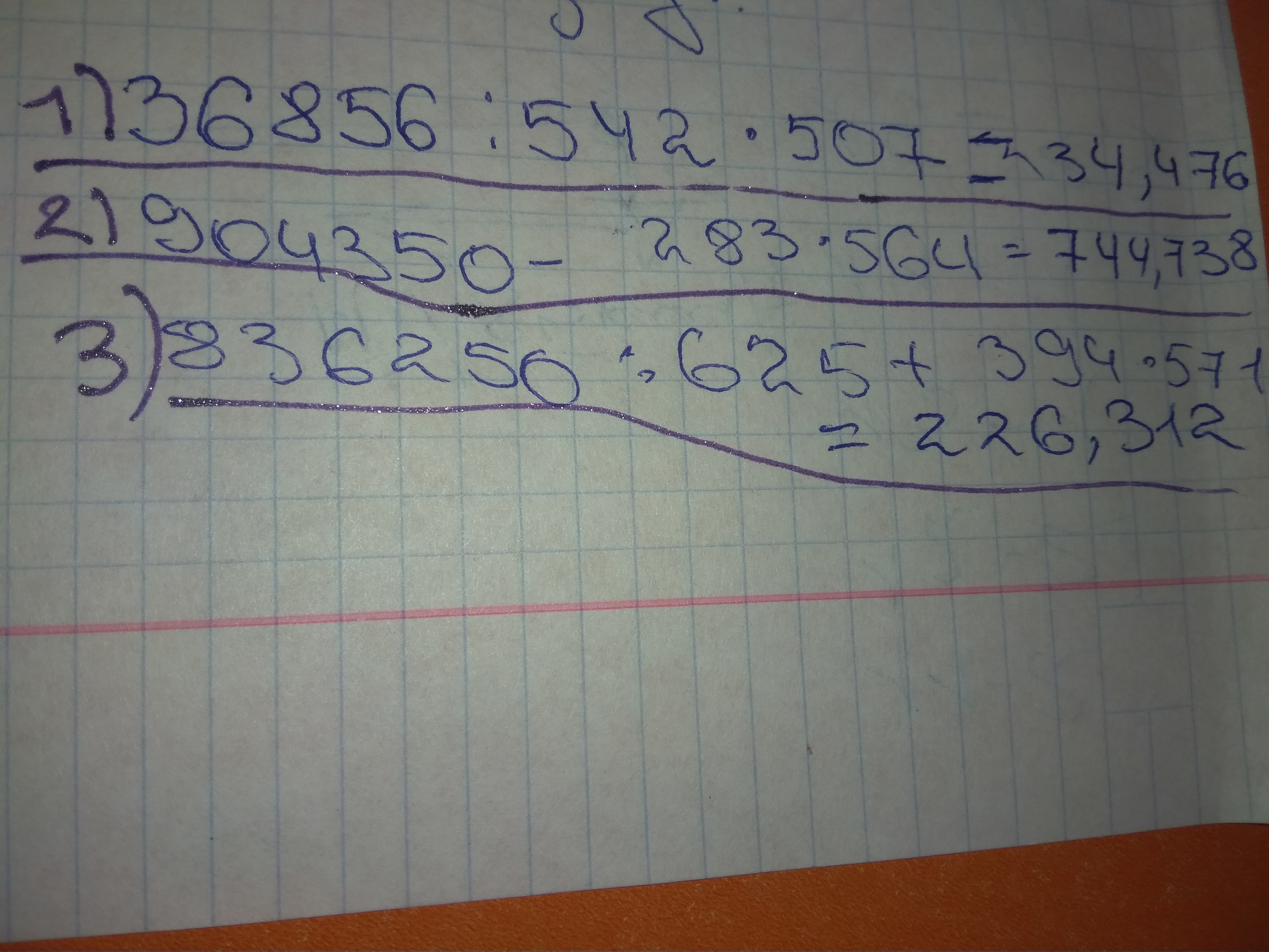 Частное чисел 36856 и 542 увеличь в 507 раз. От числа 904350 вычти произведение чисел 283 и 564. К частному 836250 и 625 прибавь произведение чисел 394 и 571.