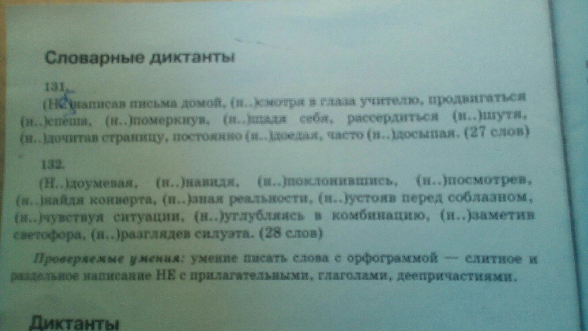 131.Не написав, несмотря, не спеша, не померкнув, не щадя, не шутя, недочитав, недоедая, недосыпая.