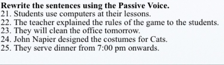 21. Computers are used by students at their lessons.22. The rules of the game were explained to the students by the teacher.23. The office will be cleaned tomorrow.24. The costumes for Cats were designed by John Napier.25. Dinner is served from 7:00 pm onwards.