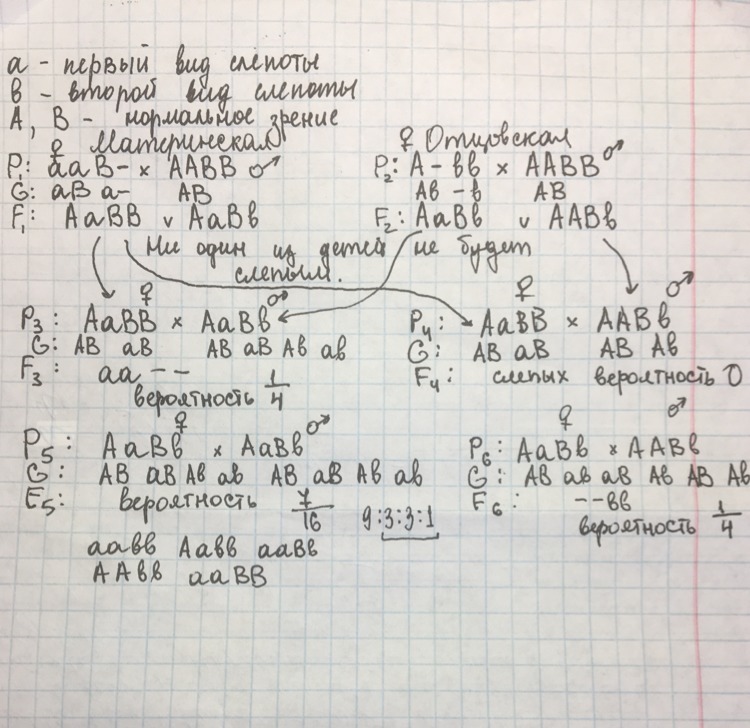Существует два вида наследственной слепоты, каждый из которых определяется своим рецессивным геном (a или b). Оба аллеля находятся в различных парах гомологичных хромосом и не взаимодействуют друг с другом. Бабушки по материнской и отцовской линиям имеют различные виды слепоты. Оба дедушки хорошо видят (не имеет рецессивных генов). Определите генотипы бабушек и дедушек, генотипы и фенотипы их детей и внуков, рассчитайте вероятность рождения внуков слепыми. Объясните полученные результаты.