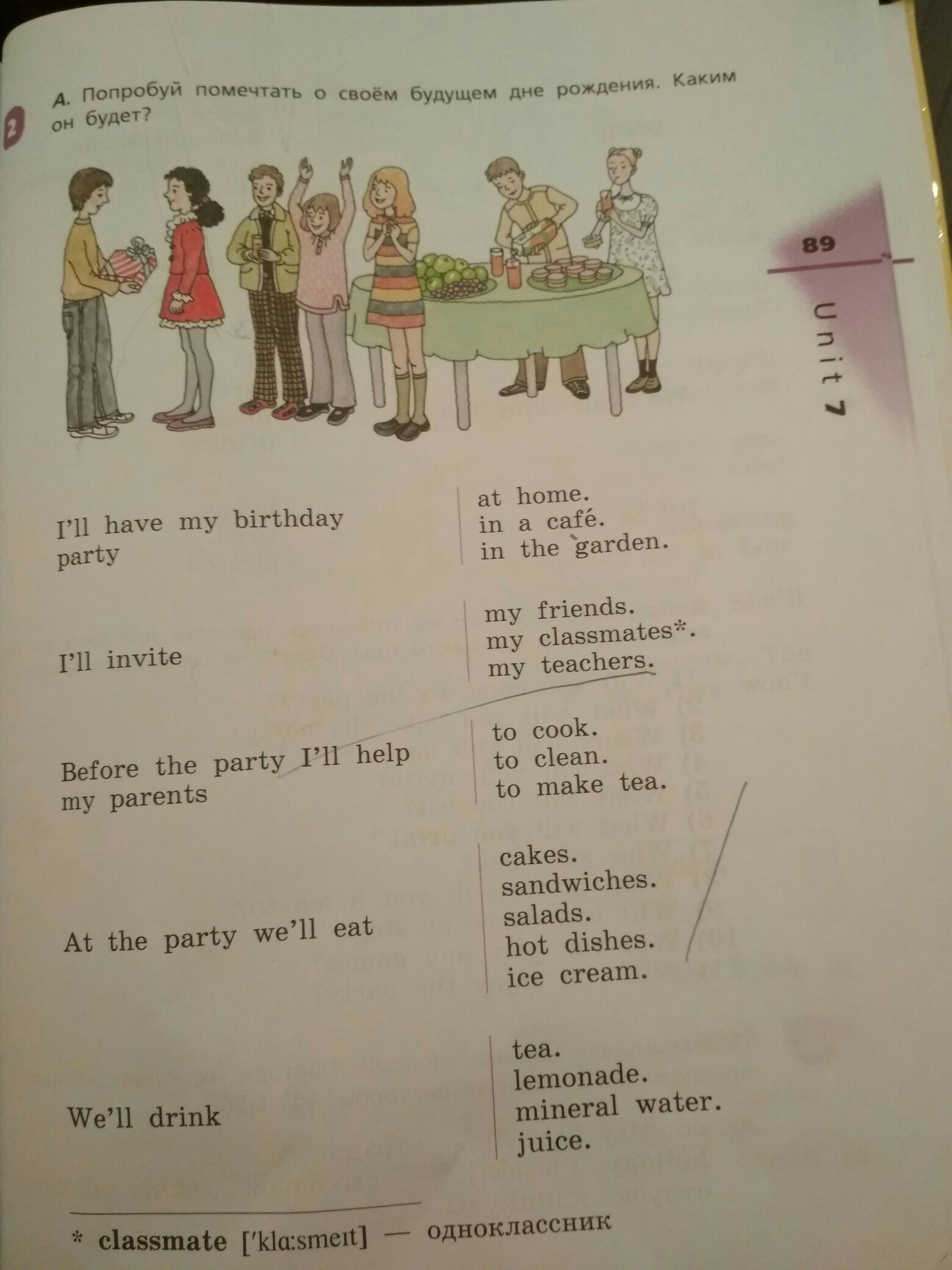 I'll have my birthday party at home. I'll invite my friends. Before the party I'll help my parents to cook. At the party we'll eat cakes. We'll drink juice.