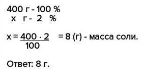 Для приготовления 400 гр 2 (процента)-ного раствора соли необходимо взять соль массой