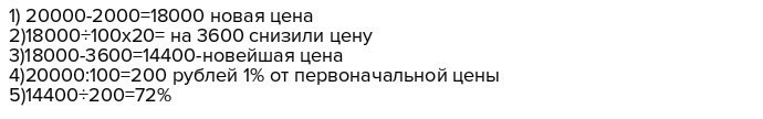 в январе в магазине появилась новая модель планшета по цене 20000 рублей. через полгода цена на эту модель снизилась на 2000 рублей, а через год- ещё на 20% от новой цены. сколько процентов первоначальной цены составила стоимость планшета через год?