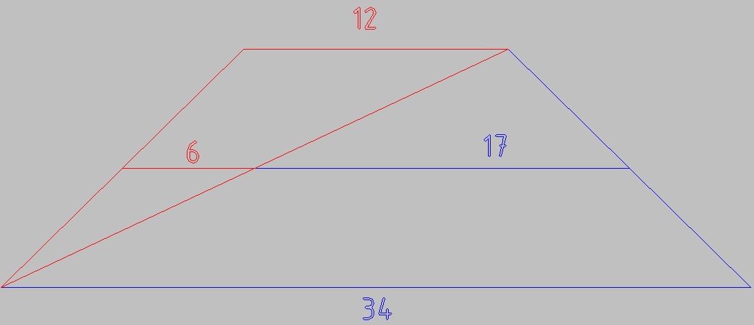 Диагональ отсекает от неё отрезки 12/2 = 6 и 34/2 = 17