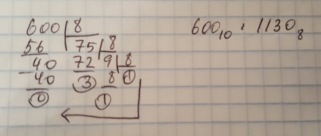 Например, данное число 600₁₀ мы будем делить на "8", пока частное не будет меньше восьми. В качестве ответа записываем остатки от деления слева-направо.