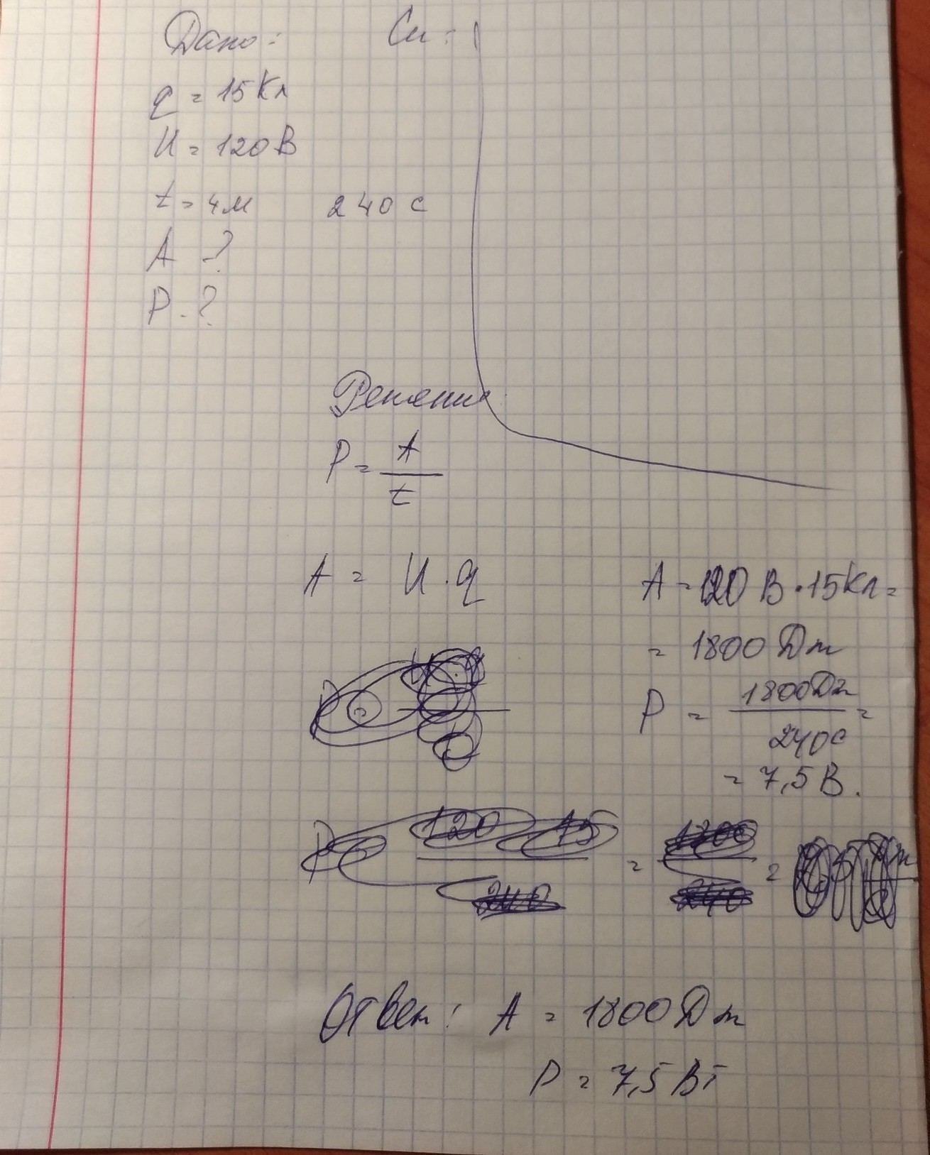 Заряд, прошедший по проводнику, равен 15 Кл Напряжение на концах участка цепи равно 120 В, время прохождения заряда - 4 минуты. Какую работу совершил электрический ток в проводнике? Какова мощность тока в цепи?