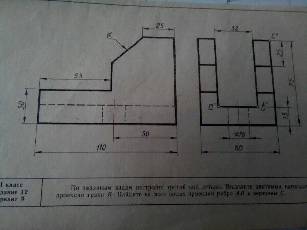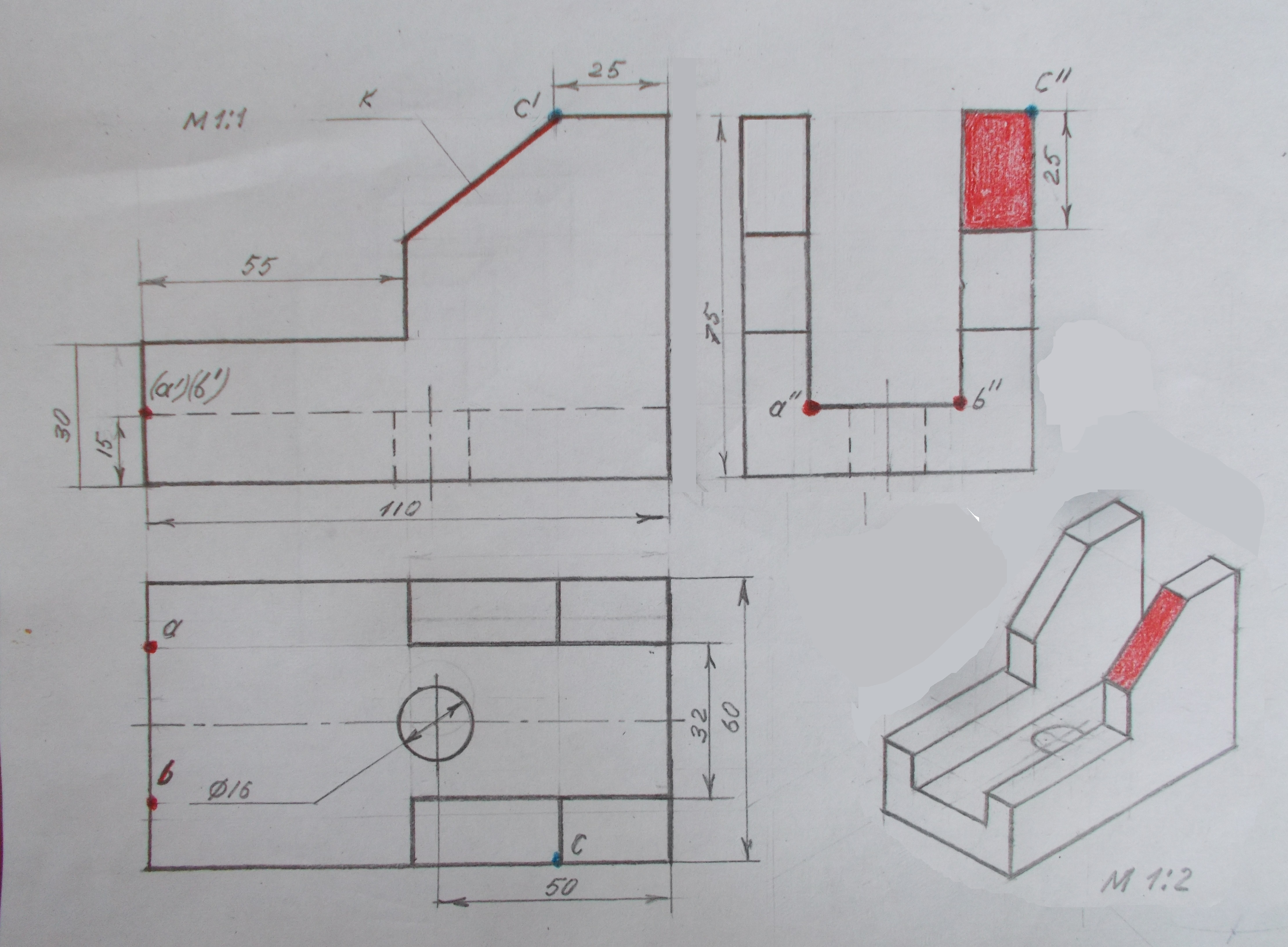 Построение вида сверху и наглядного изображения показано на рисунке: