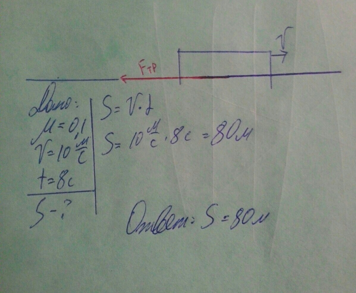Сани движутся по горизонтальной поверхности со скоростью 10 м/с. Коэффициент трения между полозьями саней и дорогой равен 0,1. Какой путь пройдут сани за 8с?
