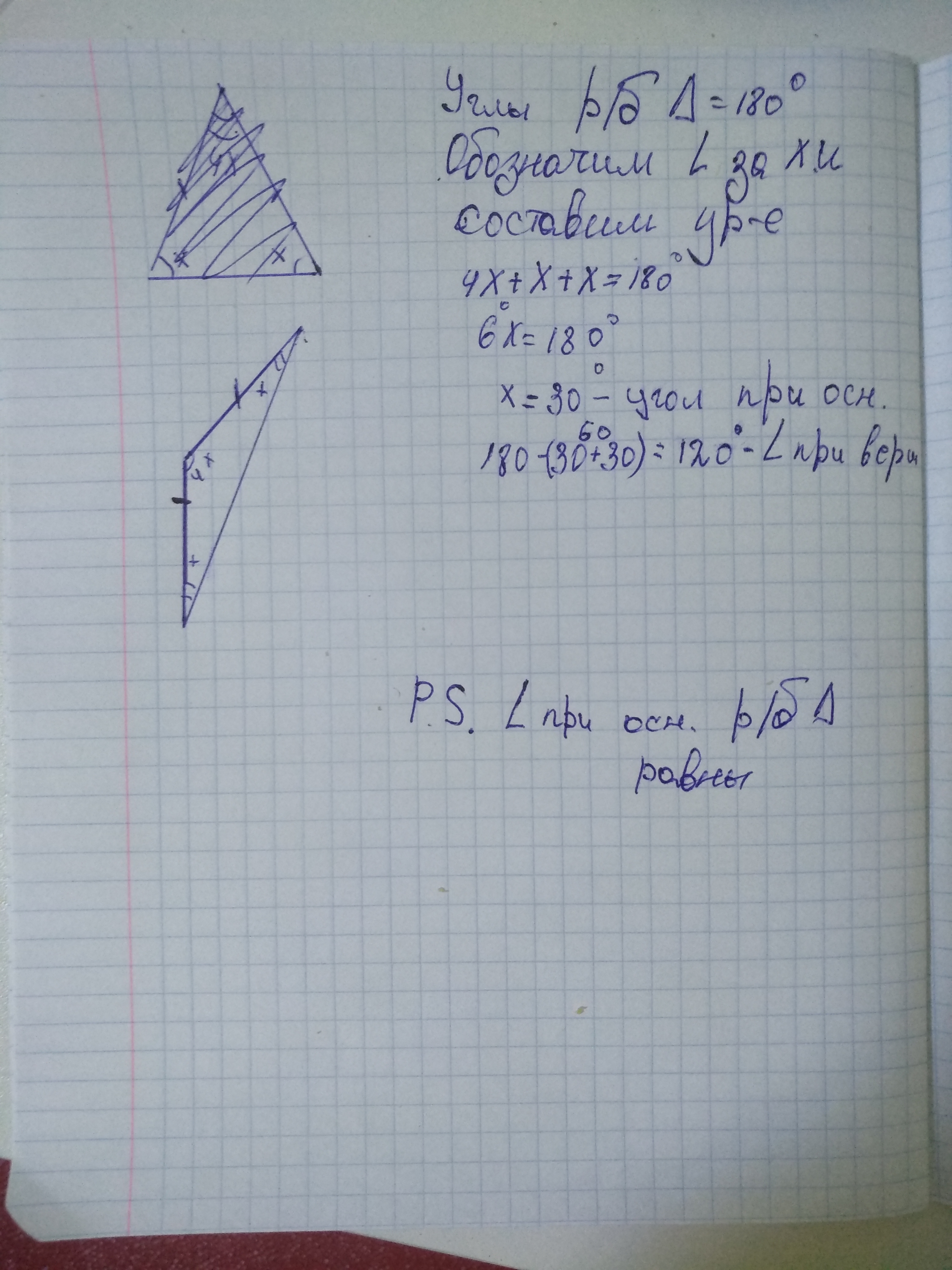 известно что угол при вершине равнобедренного треугольника в четыре раза больше угла при основании. найдите углы треугольника