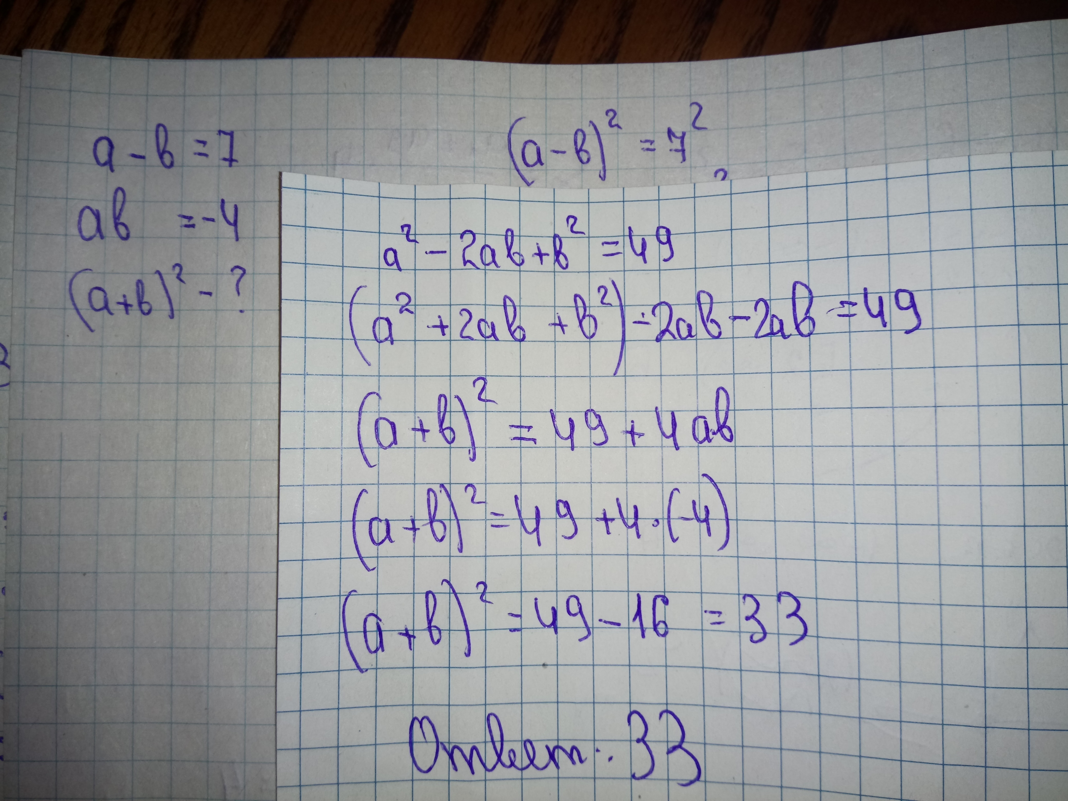 Известно что а - b = 7, ab = -4. Найдите значение уравнения ( а + b ) ²( Желательно с объяснениями!