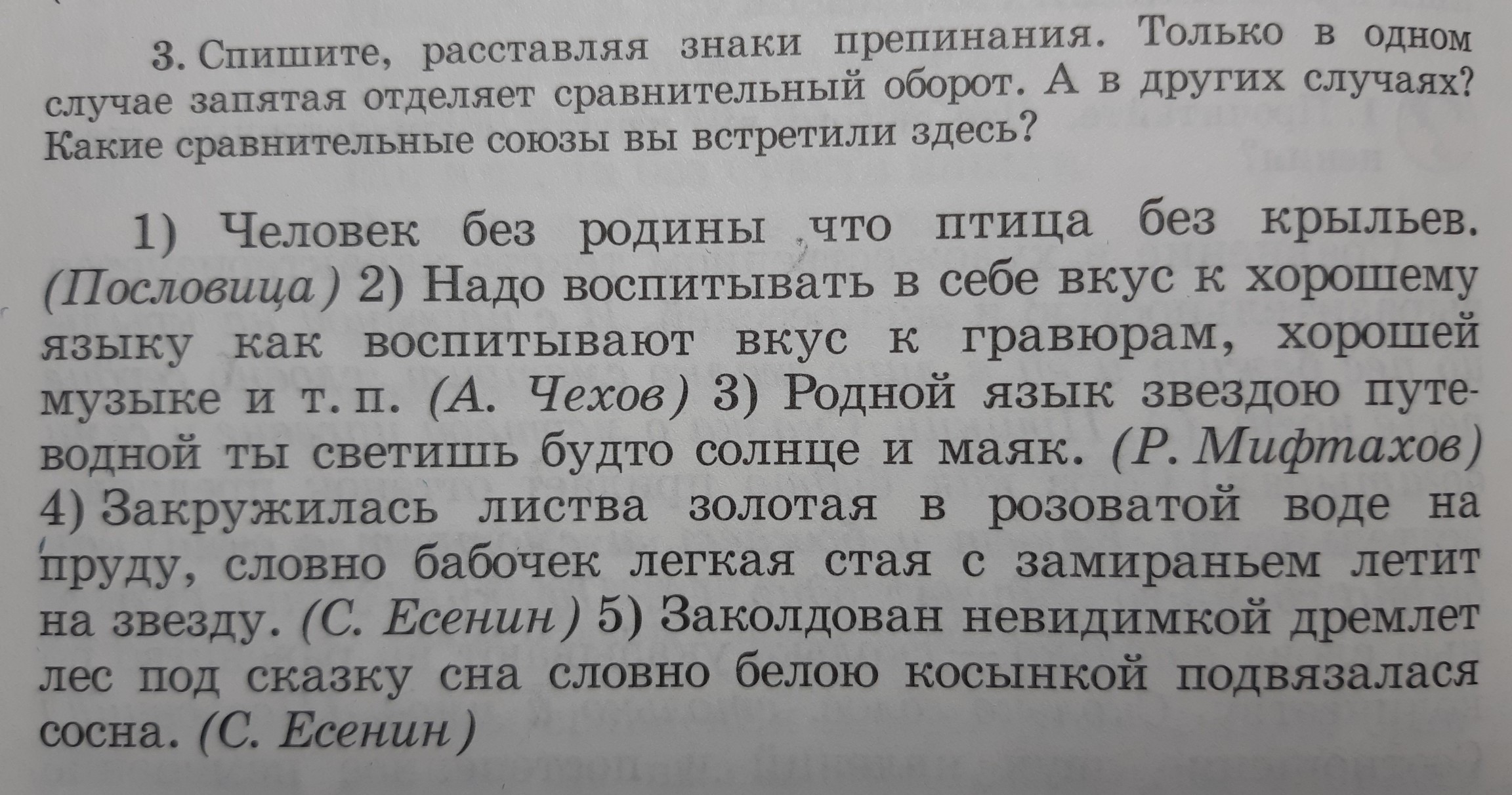 Человек без родины , что птица без крыльев .2) Надо воспитывать в себе вкус к хорошему языку , как воспитывают вкус к гравюрам , хорошей музыке и т.п. 3) Родной язык, звездою путеводной ты светишь будто,солнце и маяк . 4) Закружилась листва золотая в розоватой воде на пруду, словно бабочек легкая стая с замираньем летит на звезду. 5) Заколдован невидимкой, дремлет лес под сказку сна , словно белою косынкой подвязалася сосна .