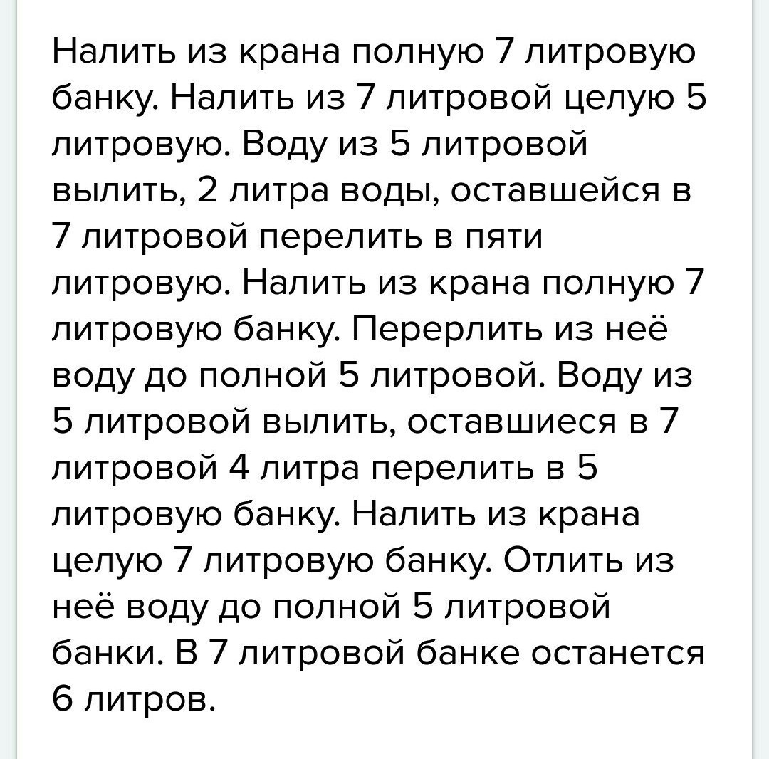 Налить из крана полную 7 литровую банку. Налить из 7 литровой целую 5 литровую. Воду из 5 литровой вылить, 2 литра воды, оставшейся в 7 литровой перелить в пяти литровую. Налить из крана полную 7 литровую банку. Перерлить из неё воду до полной 5 литровой. Воду из 5 литровой вылить, оставшиеся в 7 литровой 4 литра перелить в 5 литровую банку. Налить из крана целую 7 литровую банку. Отлить из неё воду до полной 5 литровой банки. В 7 литровой банке останется 6 литров.