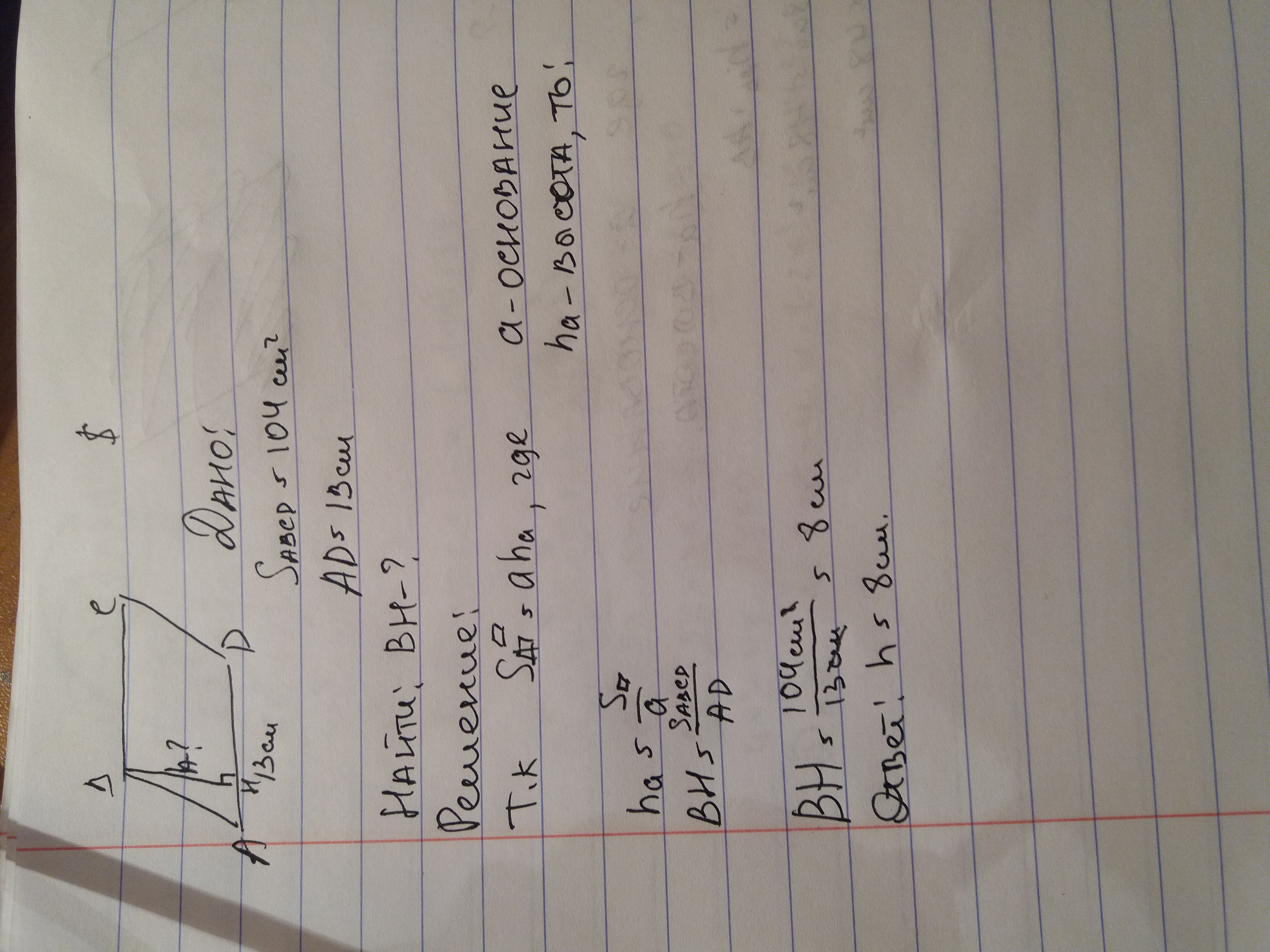 Площадь параллелограмма равна 104 см2 а одна из его сторон 13 см. Найдите высоту параллелограмма проведенную к этой стороне