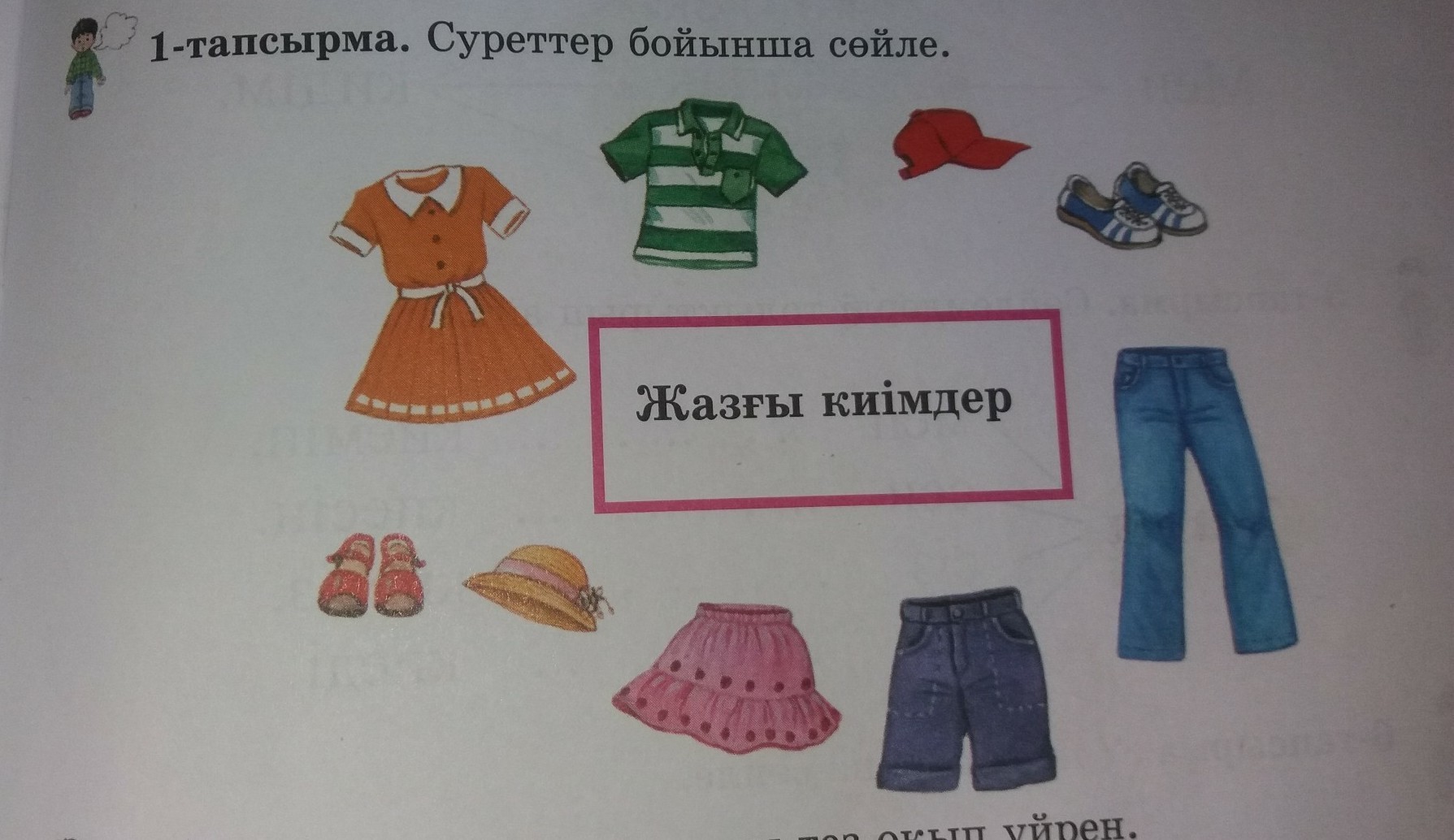 Біз жаз басталғанда қысқы, жылы киімдерімізді басқа жерге қойып, жазғы киімдерімізді шығарып қоямыз. Суретте көрсетілгендей Жазда біз жеңіл көйлектерді,ашық аяқ киімдерді, қысқы шалбар және т.б. Киімдерді шығарамыз. Жазғы киімдер жеңіл және ашық болады. Мен де ауа райына қарап киінемін. Менің жезда киетін киімдерімнің кейбіреулері осы суретте бейнеленген.