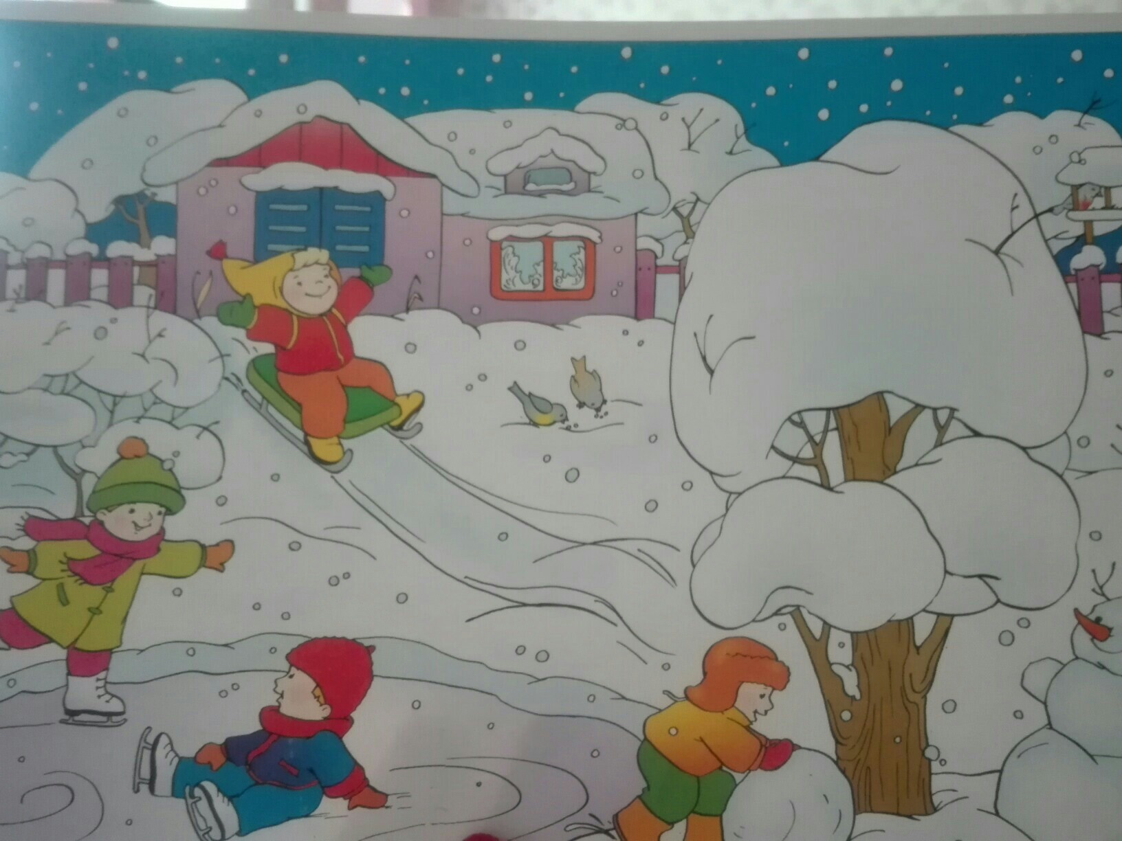 зимой мы катаемся с ледяных горок, лепим снеговика