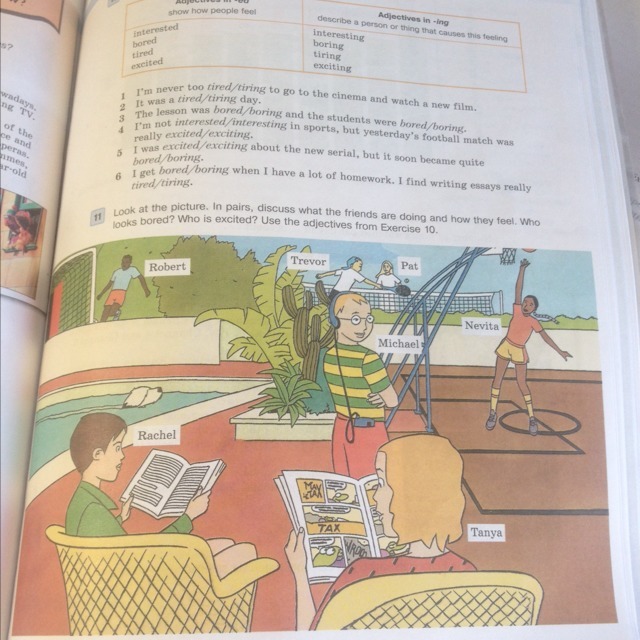 friends are playing the sport games.There are:basketball,tennis,football.But there are people that looks very bored.For ex Michael just listenning to music,Rachel with Tanya disscussing new of stars in the magazines .Even a dog swims <but they do something that is not useful.