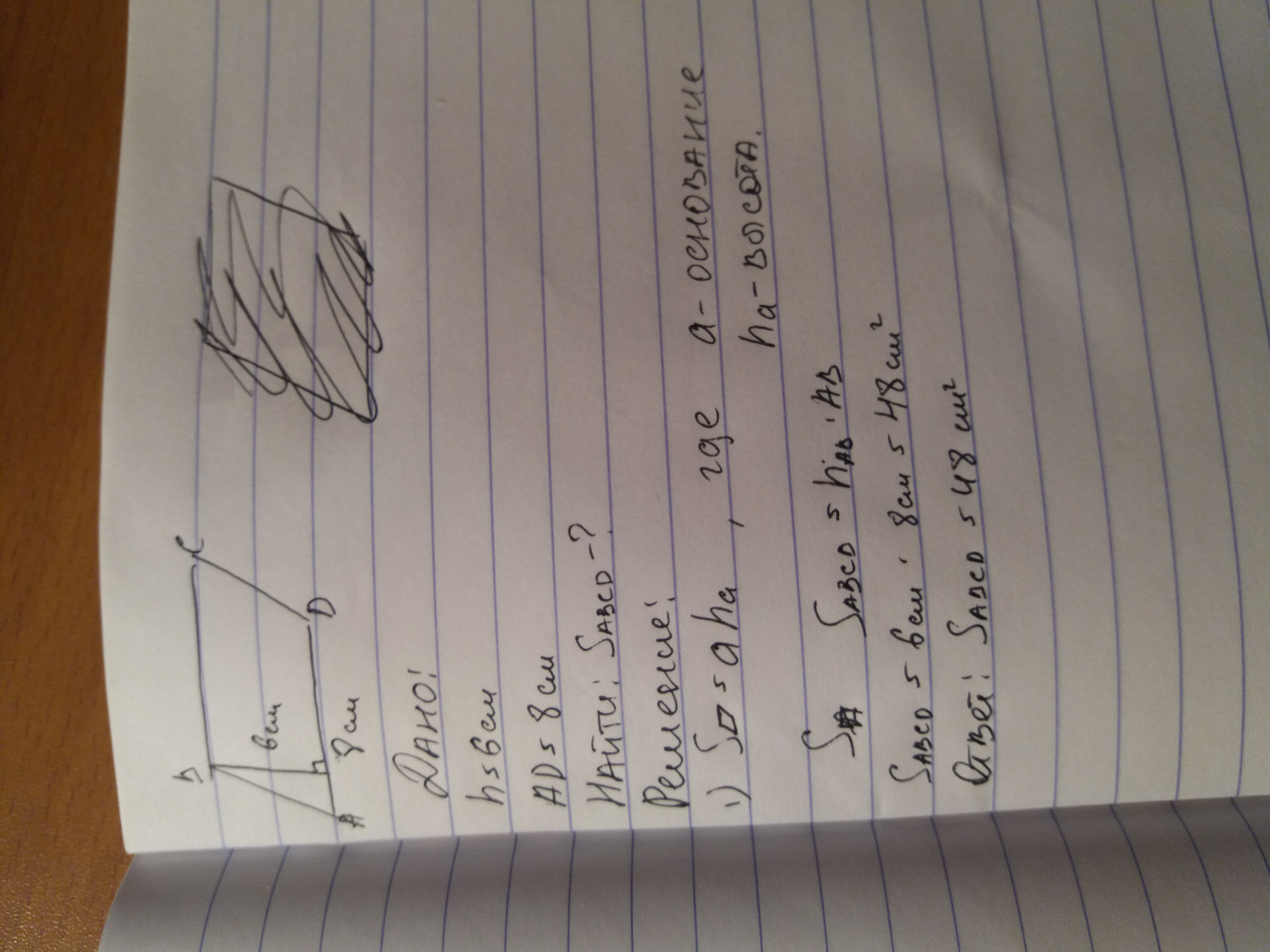 Площадь параллелограмма, со стороной 8см и высотой, проведенной к этой стороне, равной 6 см равна: