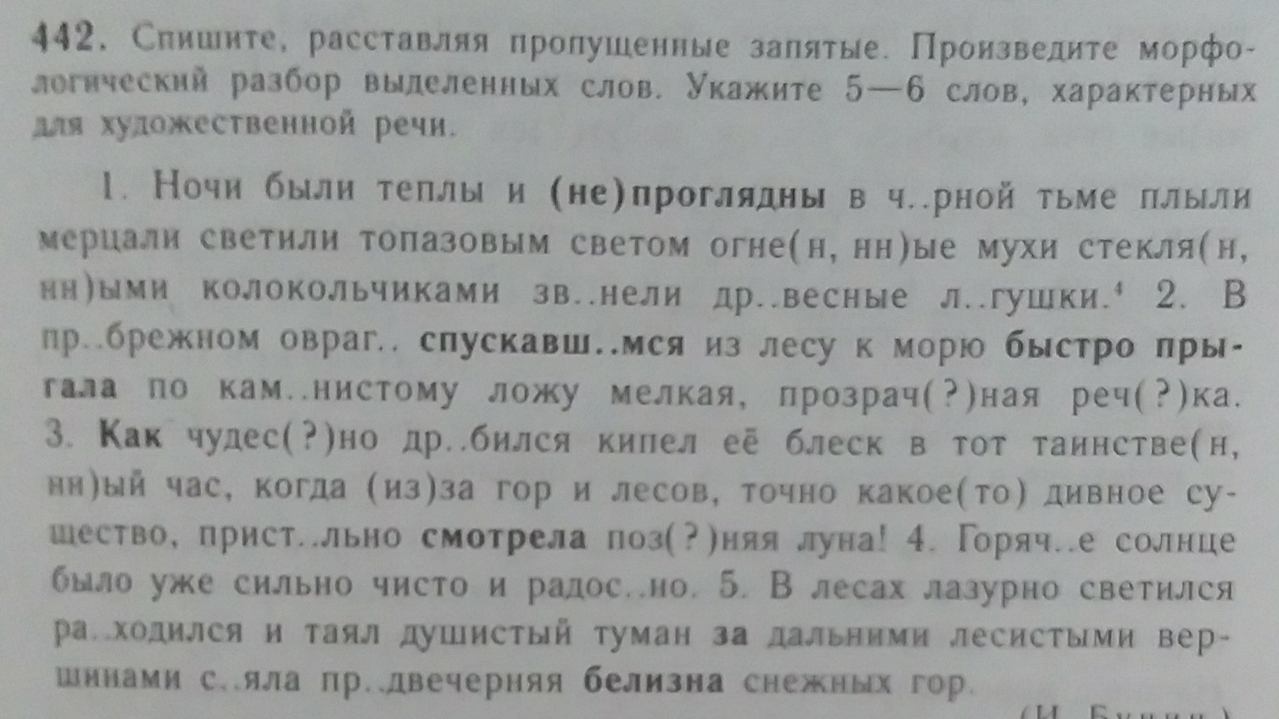 1. Ночи были теплы и не проглядны, в черной тьме плыли, мерцали, светили топазовым светом огненные мухи, стеклянными колокольчиками звенели древесные лягушки. 2. В прибрежном овраге, спускавшемся из лесу к морю, быстро прыгала по каменистому ложу мелкая, прозрачная речонка. 3. Как чудесно дробился, кипел ее блеск в тот таинственный час, когда из-за гор и лесов, точно какое-то дивное существо, пристально смотрела поздняя луна! 4. Горячее солнце было уже сильно, чисто и радостно. 5. В лесах лазурно светился, расходился и таял душистый туман, за дальними лесистыми вершинами сияла предвечерняя белизна снежных гор.