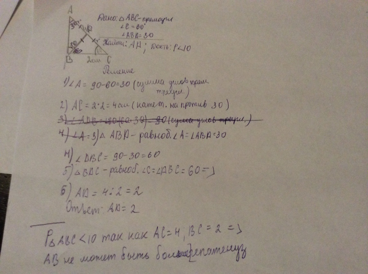 В треугольнике ABC угол B=90 градусов угол с=60 градусов BC= 2 см. На стороне FC отмечена точка D так что угол ABD равен 30 градусов а) найдите длину отрезка AD b) докажите что периметр треугольника ABC меньше 10 см
