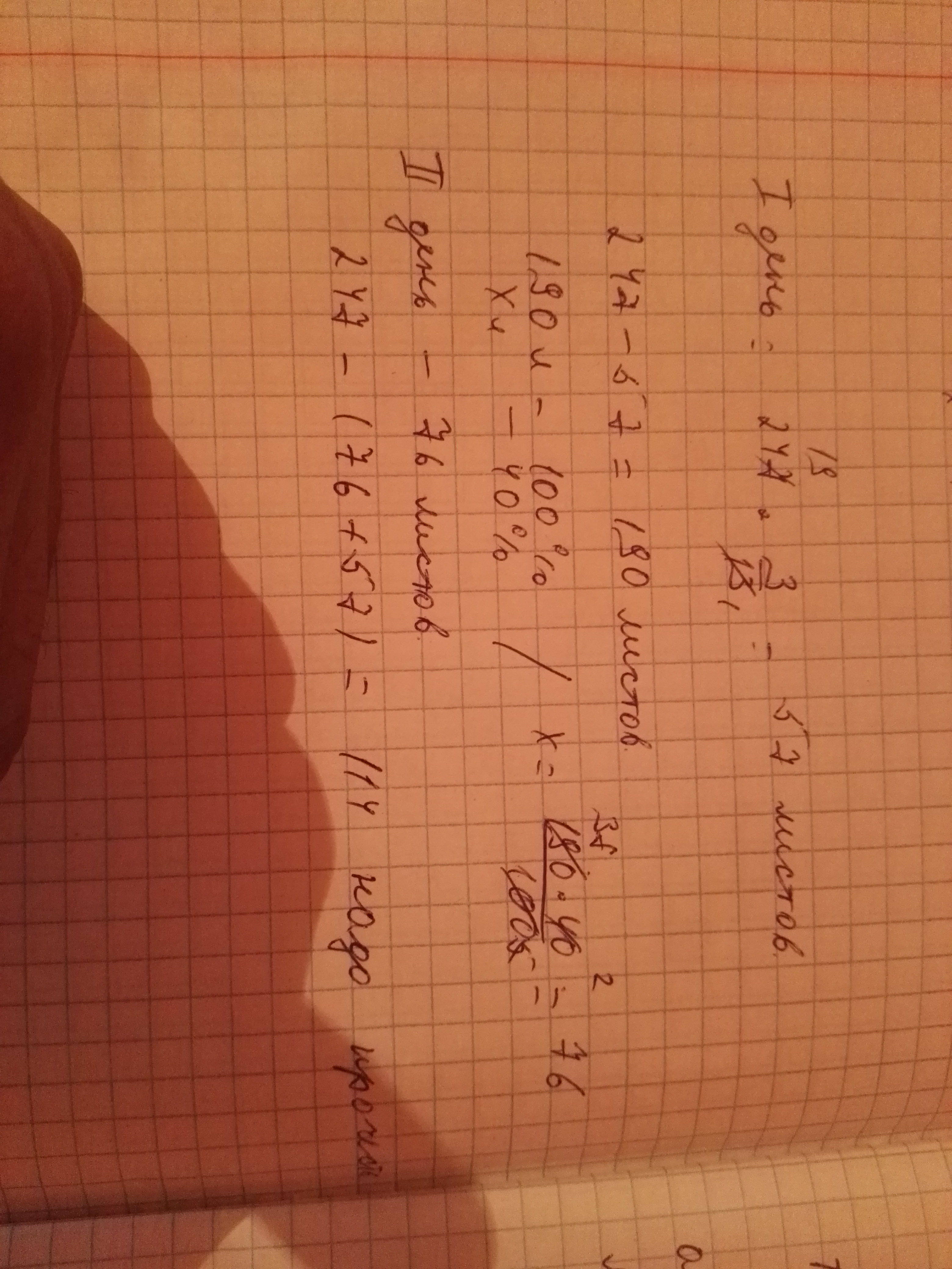 В книге 247 страницы. В первый день было прочитано 3/13 всех страниц, а во второй день- 40% оставшихся страниц. Сколько страниц ещё надо будет прочитать?