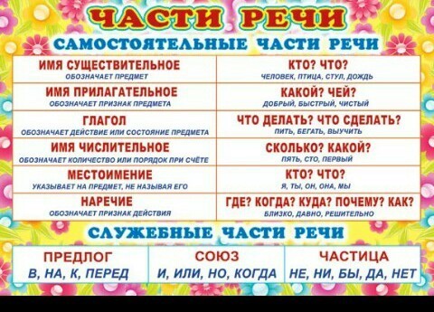 часть речи-это сущ. прил.гл. предл. мест. нареч. числ.