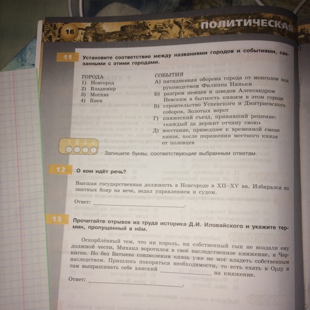 11. 3А, 1Б, 2В, 4Д Г-лишнее.12. Это Посадник-высшая гос.должность в новгородской республике в 12-15 вв.