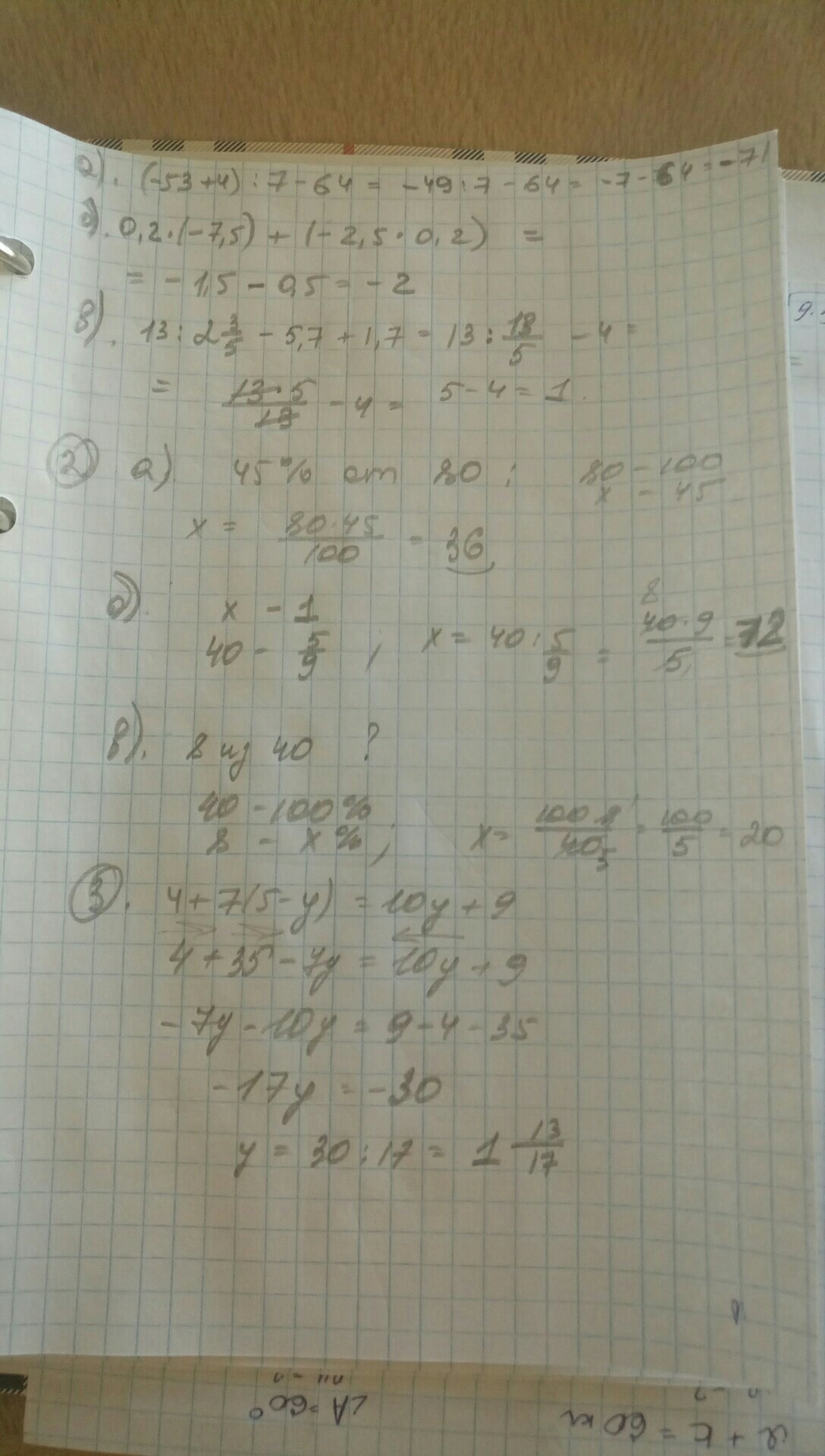 чуваки помогите срочно у меня оценка решается а я болел и не понимаю нихрена 1) а) (-53+4):7-64 б) 0,2×(-7,5)+(-2,5)×0,2 в) 13:2целых3/5-5,7+1,7 2) a) Найти 45% от 80 б) найди число,5/9 которого =40 в) сколько % составляет 8 из 40 3) 4+7 (5-у) = 10у+9 всё... помогите пожалуйста буду очень благодарен