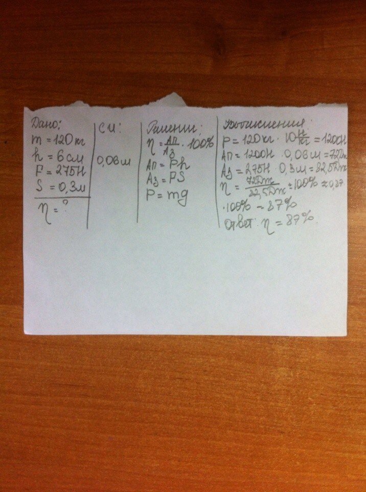 Вычислите КПД рычага с помощью которого груз массой 120 кг равномерно подняли на высоту 6 см, при этом к длинному плечу рычага была приложена сила 275 н,а точка приложения этой силы опустилась на 0,3 метра Срочно!!! Помогите пожалуйста