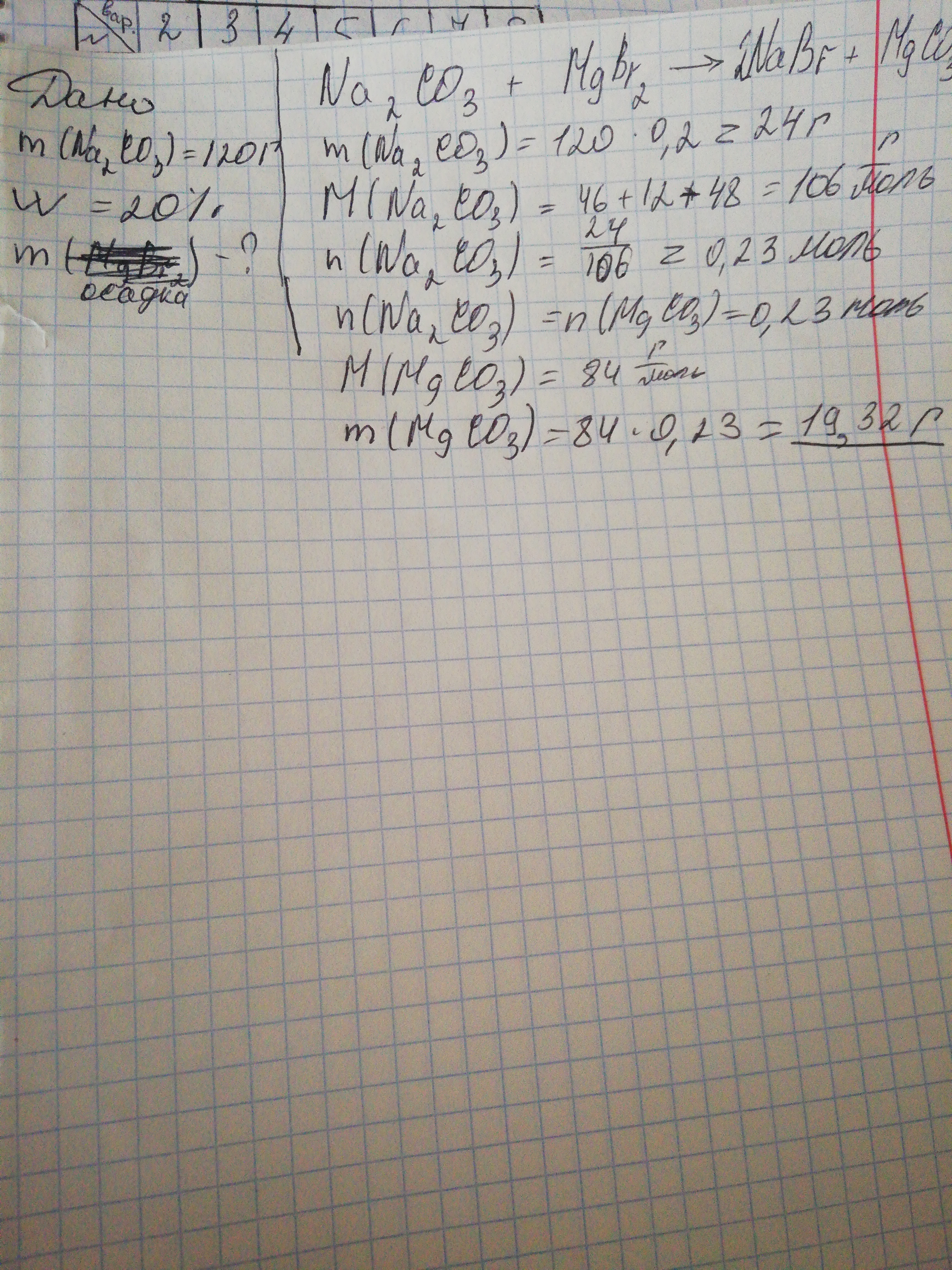 При взаимодействие раствора Na2CO3 m=120 гр и W(массовой долей)=20% MgBr2 получился осадок.Найдите массу этого осадка.
