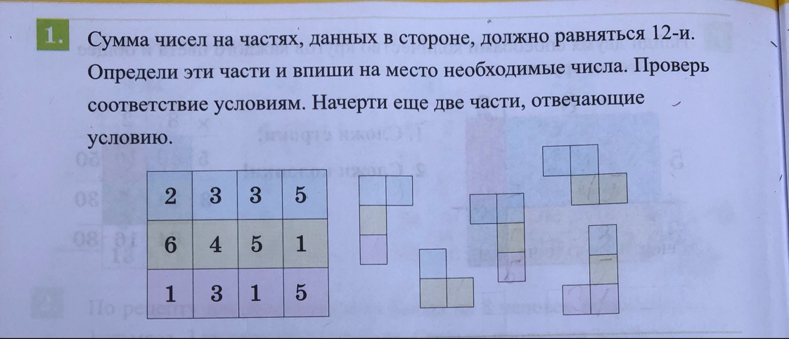 ❓сумма чисел на частях данных в стороне должно равнятся 12-и. Определи эти части и впиши на место необходимые числа.Проверь соответствие условиям.Начерти еще две части, отвечающие условию