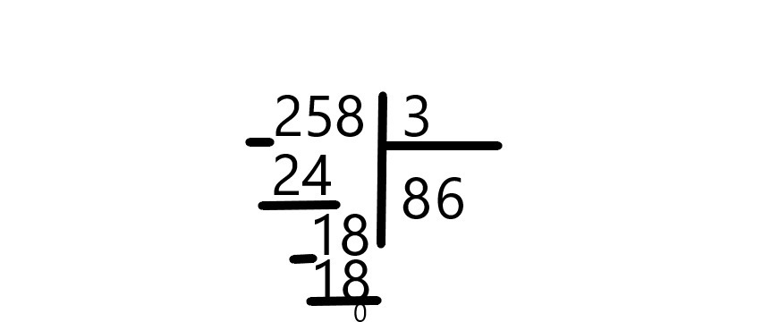 Всё легко. Берём число, которое нужно поделить. В данном случае 258 и делим на 3. На фото всё показано. (Получается 86)