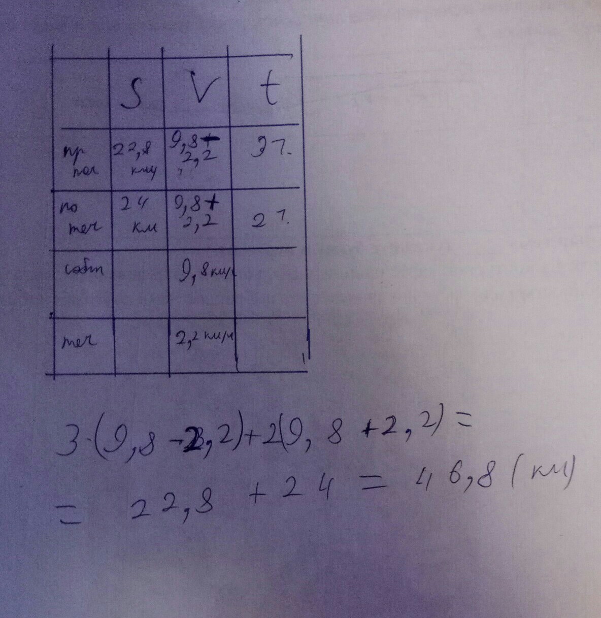 2*12 + 3*7,6 = 24 + 22,8 = 46,8 (км) прошла лодка
