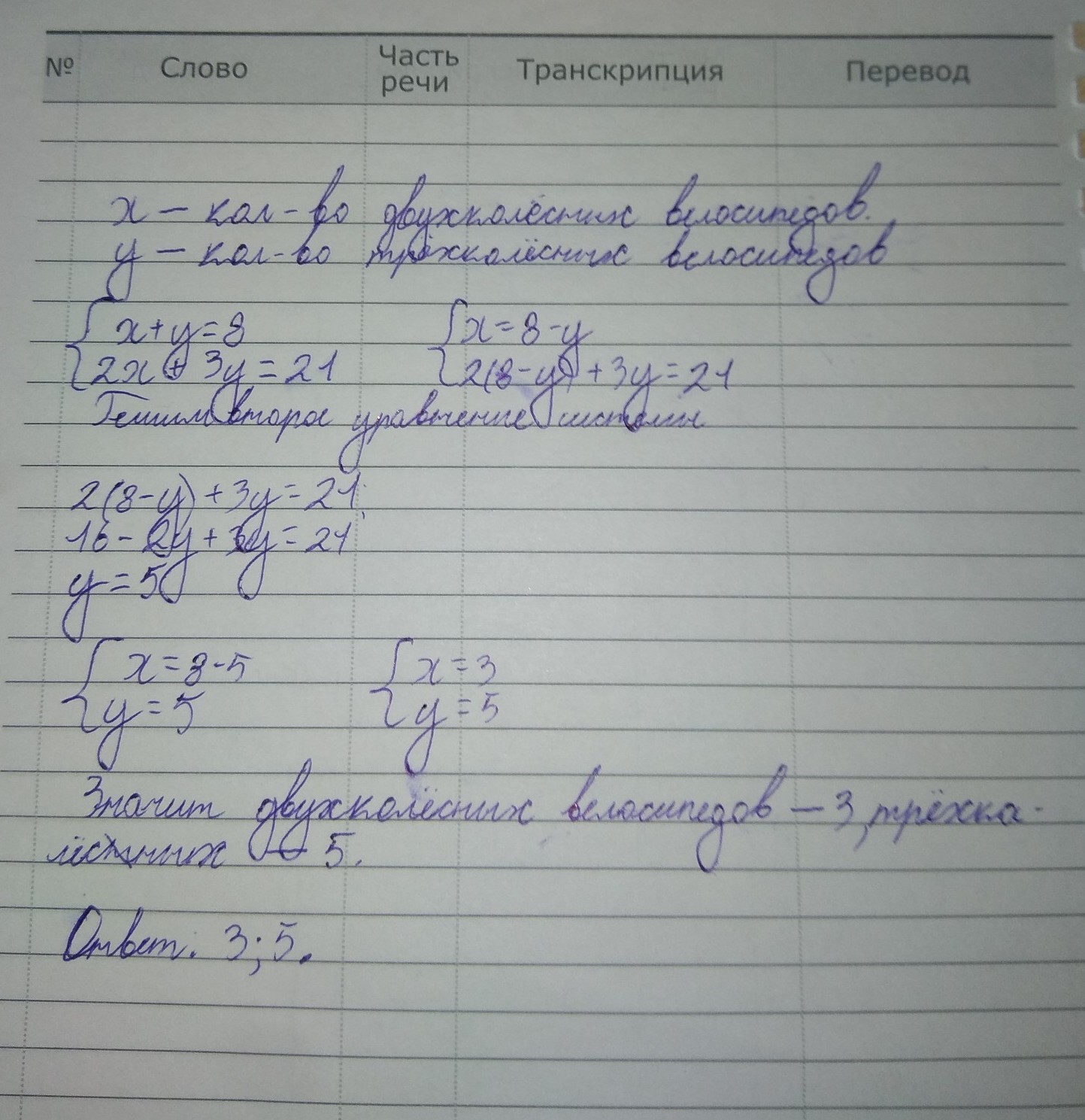 Решал с помощью системы линейных уравнений с двумя переменными