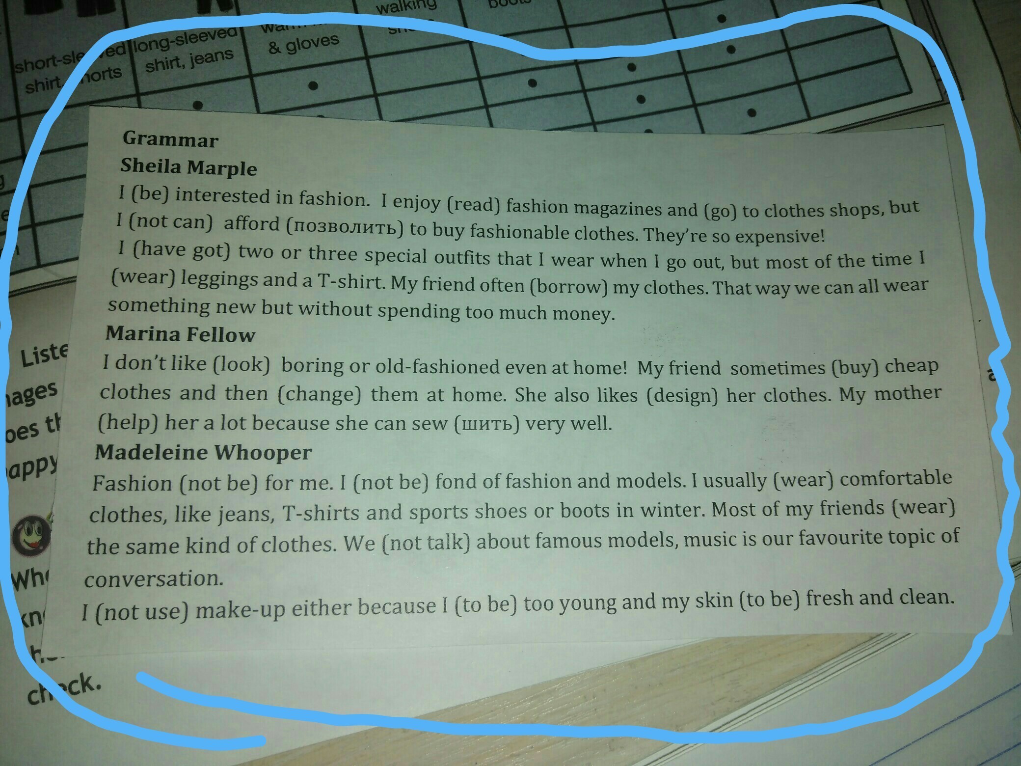 am, reading,going,can't,have c got,wear,borrows,looking, buys,changes,designing, helps,isn't,am not, wear,wear,don't talk,don't use,am,is