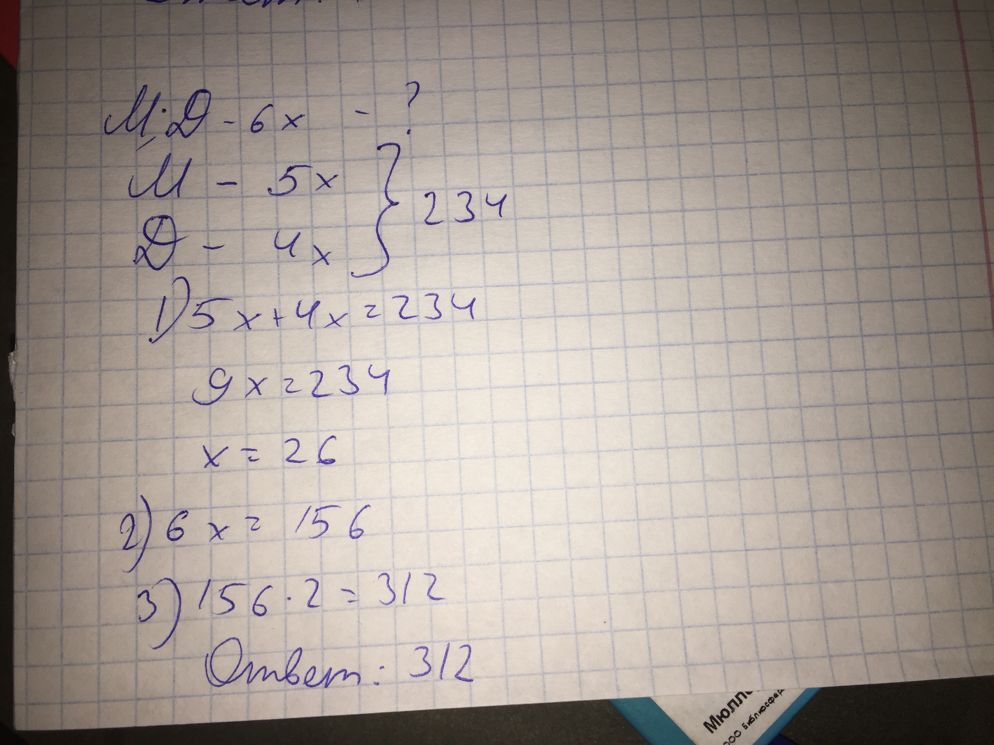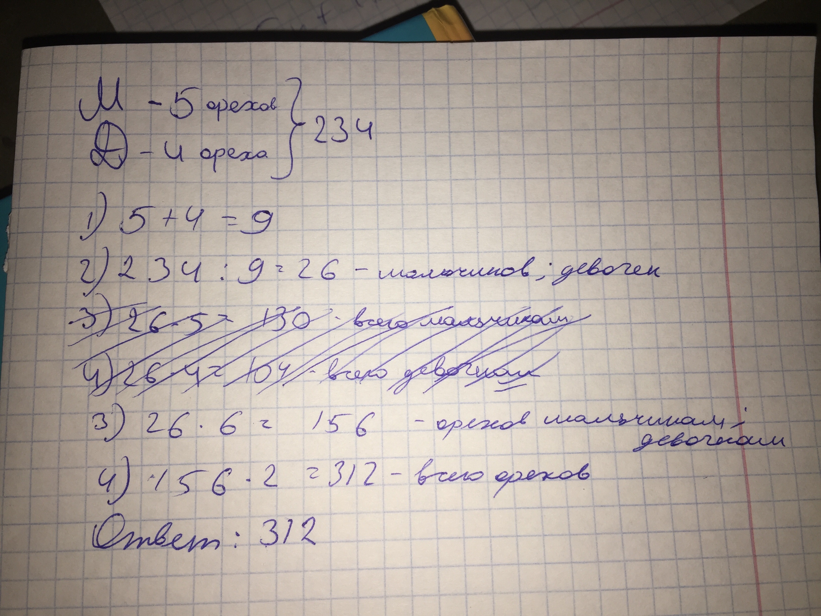 в школе равное число девочек и мальчиков. я принёс 234 ореха и каждому мальчику досталось по 5 орехов каждой девочке по 4 ореха но девочки обиделись и в другой раз я принёс столько орехов что всем досталось по 6 сколько орехов я принёс? плез с краткой записью ат о убьёет( а у меня всё впереди