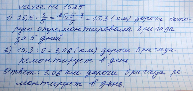 длина дороги 25.5км. За 5 дней бригада отремантировала ³5 дороги , ремонтируя ежедневного участия дороги одинаковой длины. Сколько километров дороги бригада ремонтировала за один день